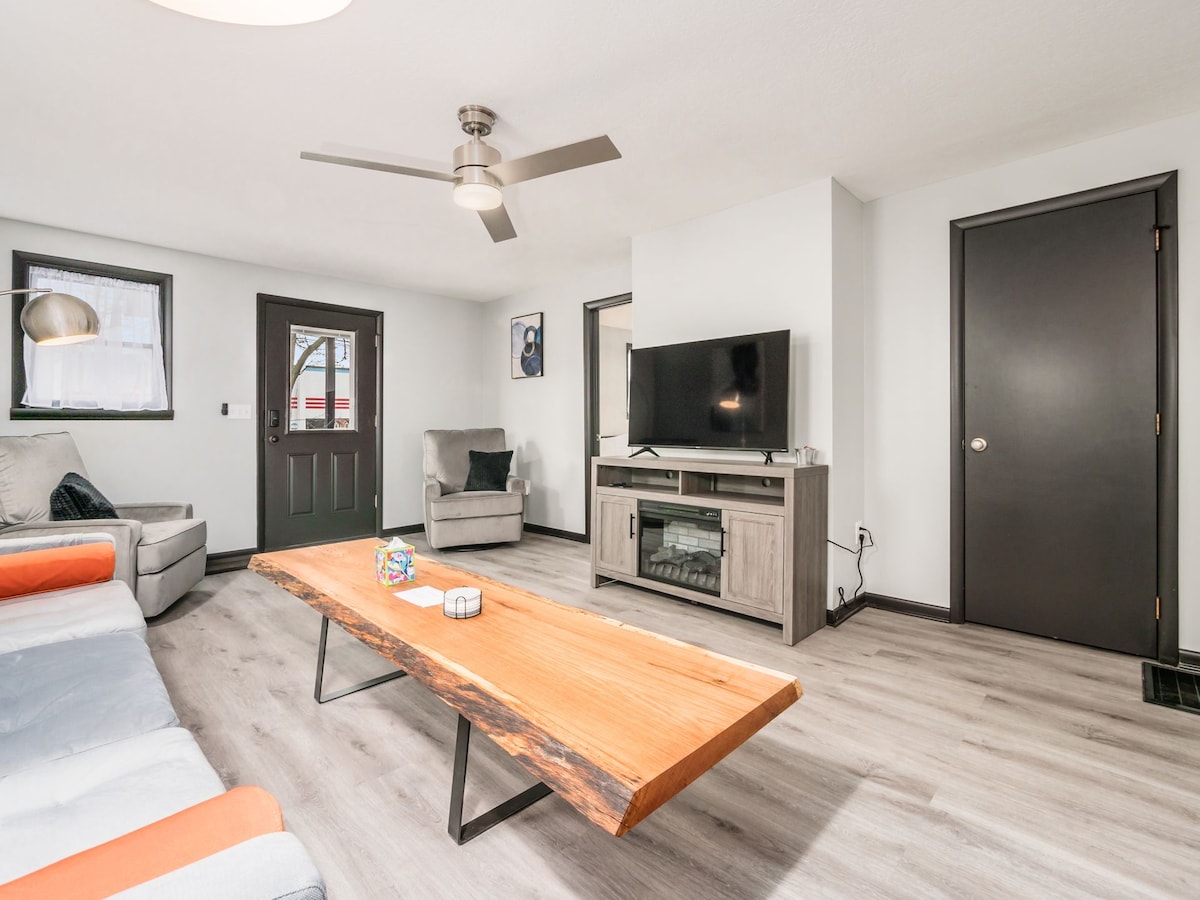 🔷Key Features🔷 ☀Single-level, ranch style home ☀Free street parking in front of the home on a quiet one-way street ☀Courtyard patio with outdoor dining and BBQ grill ☀Dog-friendly w/a fee — bring your furry friends; they like vacations too! ☀Electric fireplace ☀0.2mi to Downtown Delaware ☀0.4mi to Ohio Wesleyan University ☀Full-sized washer and dryer ☀Fully equipped kitchen ☀Central heating and cooling (no window AC units!) ☀Owned and managed by a local family with 25+ years of residency