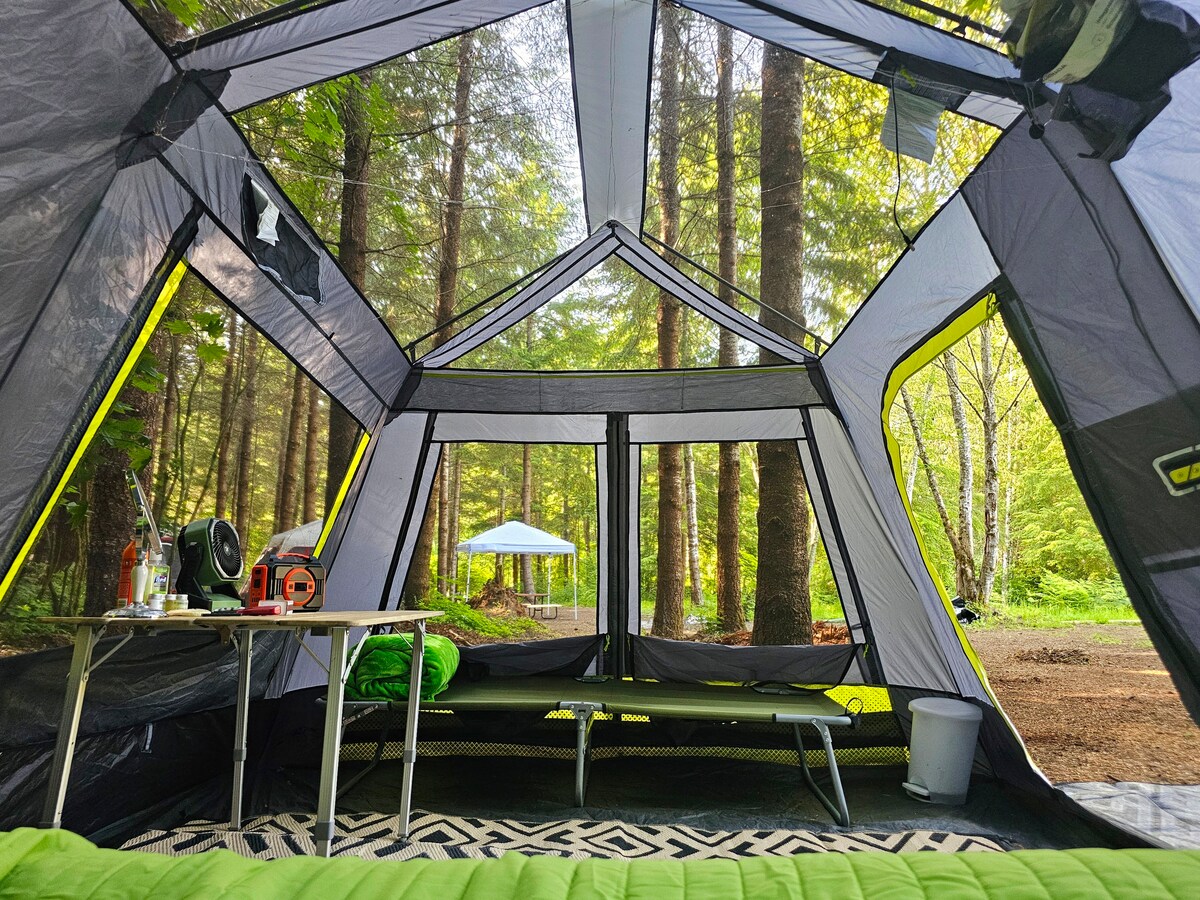Kom weer in contact met de natuur tijdens deze onvergetelijke accommodatie. Glamping Tent met uitzicht op de Cowlitz River op 75 hectare met jacuzzi (in de LoveShack). Twee zachte kinderbedjes, spoeltoiletten op loopafstand, paviljoen met elektriciteit en vuurplaats onder de sterren. Verken de 850 meter langs de rivierwandeling en neem een koude duik in de rivier!! Ontspan in rust en stilte, weg van de drukte!