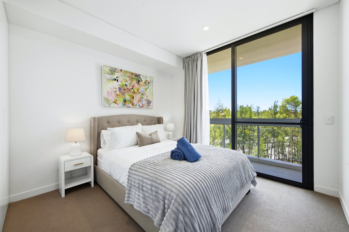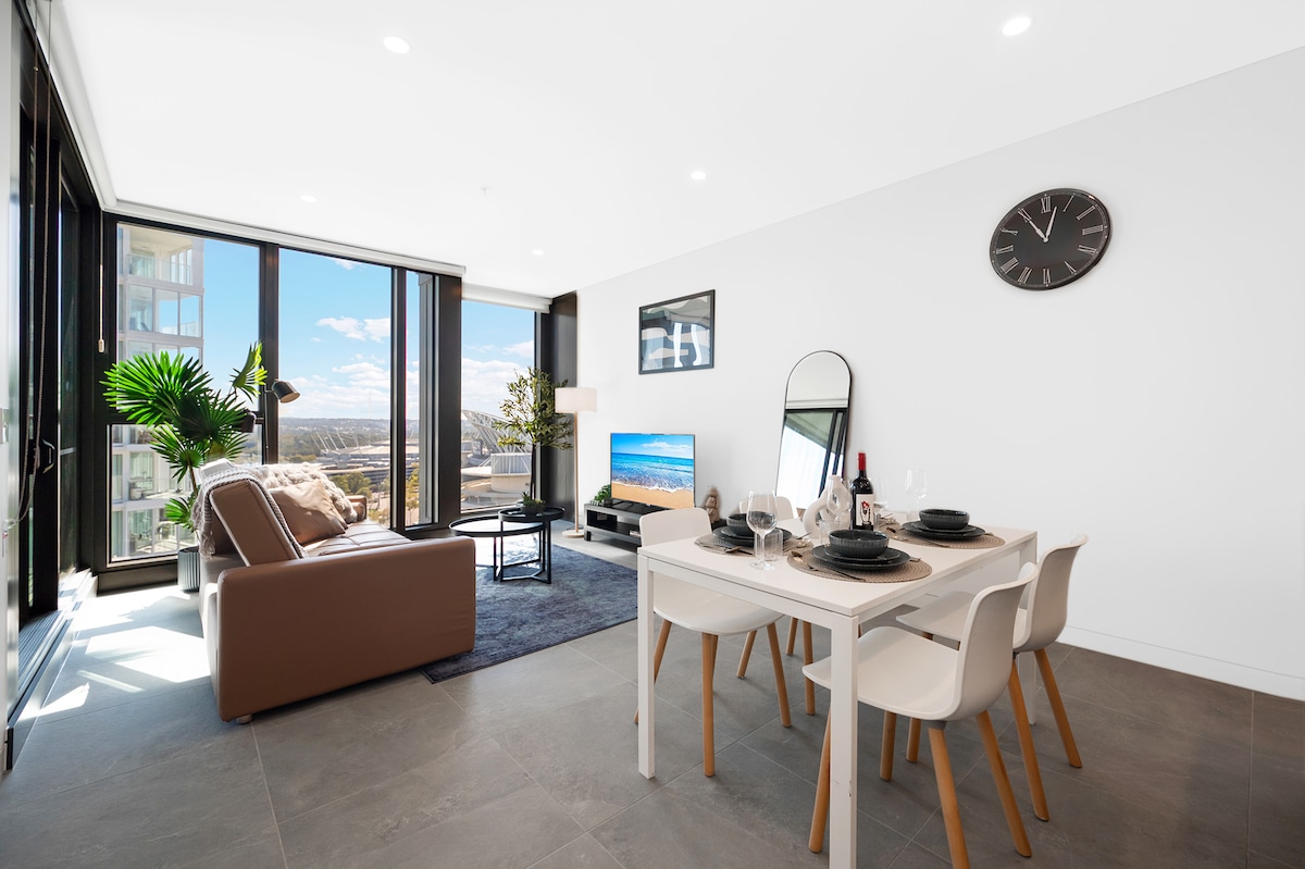 Dit gloednieuwe, stijlvolle appartement biedt uitzicht op de Sydney Harbour Bridge. Het beschikt over comfortabele en ruime meubels en queensize bedden in elke kamer voor een huiselijke ervaring. De gratis fitnessruimte beneden helpt je fit te blijven tijdens het reizen. De toplocatie beschikt over uitstekende nabijgelegen restaurants, winkels (DFO) en medische faciliteiten, allemaal binnen 2-3 minuten lopen. Het is 7 minuten lopen naar het treinstation, dicht bij het Olympisch Stadion en Aquatic Centre, en 18 minuten rijden naar Sydney Airport.