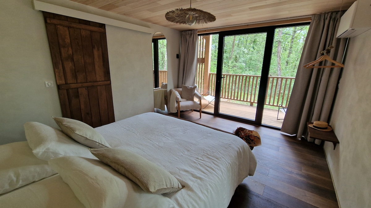 Wij verwelkomen u aan de rand van het bos in een ecologisch verantwoord houten huis, met spa, WiFi en omkeerbare airconditioning, voor een romantisch of familieverblijf in het hart van de Périgord. Genesteld in de vallei, zult u alleen zijn in de wereld voor magische momenten en zal proeven wat u hebt gekozen uit ons assortiment van lokale producten (uitgereikt op de Agricultural Competition) - eventueel na het genieten van de massages van Cécile.- Verwezen door de Guide du Routard en de Petit Futé!