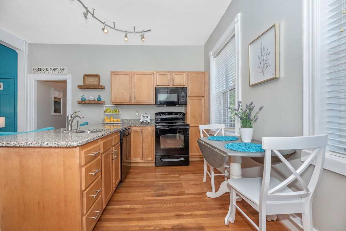 Op steenworp afstand van Carroll Creek Promenade met gemakkelijke toegang tot chique restaurants, leuke brouwerijen, lokale winkels en festivals in overvloed! Moderne renovatie en meubels, waaronder een kingsize bed van traagschuim. Geniet van je eigen appartement met brede open ruimtes en hoge plafonds die fantastisch licht binnenbrengen. Historisch gebouw (circa 1840) met alle moderne voorzieningen om je verblijf super comfortabel en leuk te maken! Eigenaren geven advies over hun favoriete plekken en restaurants! Gemakkelijk zelf inchecken. Gratis parkeren op het terrein.