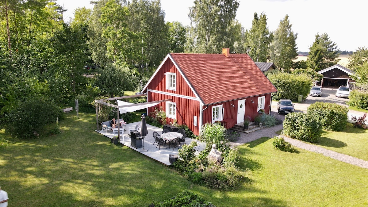 Välkommen till Ginkelösa Nygården! Flygelbyggnaden (t.v i helikopterbild) ger dig som gäst ett privat boende med mycket hög standard i lantlig miljö endast 10min från centrala Linköping. Huset är fullt utrustat med kök och 1,5 badrum + bastu och spabad utomhus. Laddare för elbil finns mot avgift. Detta boende passar bäst för den stora familjen, tjej/killgänget eller de 2-3 paren som vill ha något utöver det vanliga!