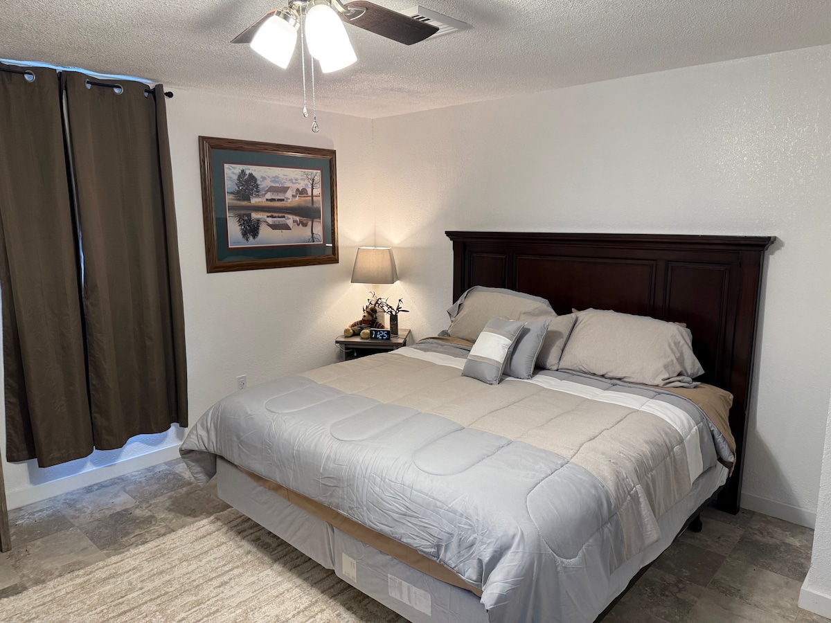 Geniet van onze gezellige overdekte patio aan de achterkant met een privacyhek, vuurplaats en een barbecue. Kijk buiten tv, eet het diner of hang gewoon rond en luister naar muziek. De ene slaapkamer heeft een queensize bed, de andere slaapkamer heeft twee eenpersoonsbedden. Beide slaapkamers zijn ook voorzien van TV. De keuken heeft alles wat je nodig hebt om thuis te dineren of iets te pakken bij een lokaal restaurant en ervan te genieten aan de eettafel of aan de achterkant. Er is een full-size wasruimte met zeep aanwezig. Alles wat je nodig hebt is er!