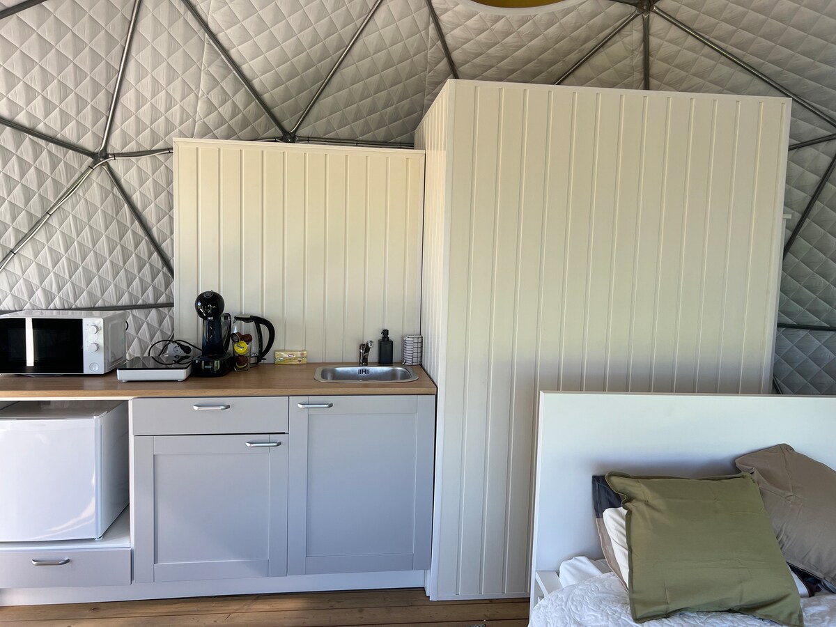 Tai modernus pabėgimas iš miesto. Patogumas, stilius ir laukinė gamta viename. Kupolas sukurtas tiems, kurie myli gamtą, tačiau nori ja džiaugtis patogiai ir stilingai. Jums čia patiks, jei vertinate kokybišką poilsį gamtoje. Kupolas nuomojamas dviem asmenims, pašalinių asmenų toje pačioje teritorijoje nebūna. Tad būsite tik Jūs ir gamta. Čia galėsite mėgautis gražia ežero panorama, irstytis valtele. Vėsesniu oru čia galėsite įlysti į karštą kubilą ar mėgautis spragsinčia krosnele viduje.