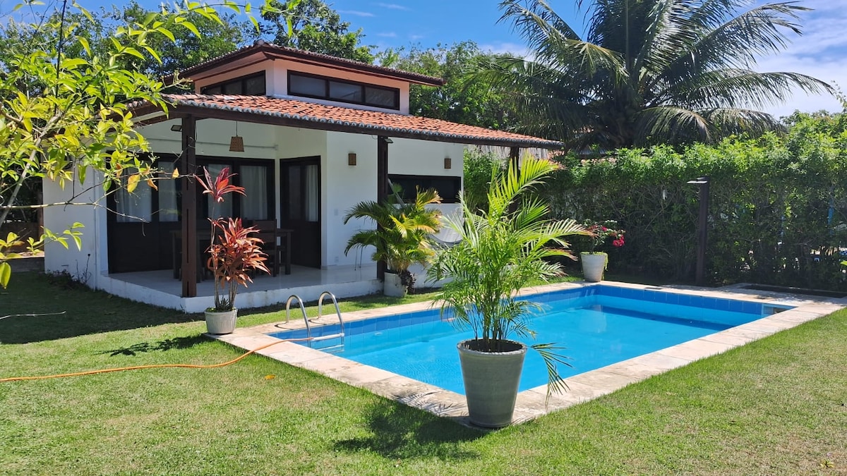 Lovely house in a small compound with a SHARED SWIMMING pool, surrounded by a lot of green, with native trees where visitors can appreciate a bit of the local wild life and see things such as beautiful tropical birds and small monkeys. The house is very well located being close to local shops, restaurants and bars and it is only 250 meters from the main beach. O aluguel mensal não inclui a eletricidade, que será cobrada separadamente.