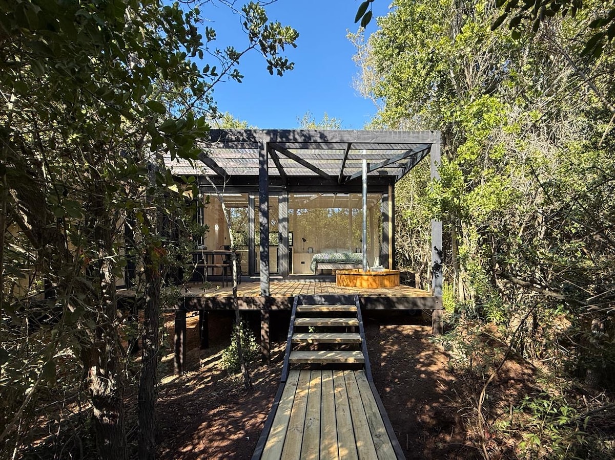 Acogedor refugio de un ambiente (24m2) de diseño único tipo tiny house , inserto en una quebrada nativa con espectacular vista a los valles donde podrás ver una gran variedad de aves . Ideal para escapar de la ciudad y refugiado del viento costero. Amplia terraza con tina exterior caliente y ducha de agua fría . Muy cercano a playas de Matanza y Pupuya. (1cama queen+camita para niños) . Se recomienda 4x4 para días de lluvia - 4,5km de Matanzas - 3.5km de La vega - 24km de Puertecillo
