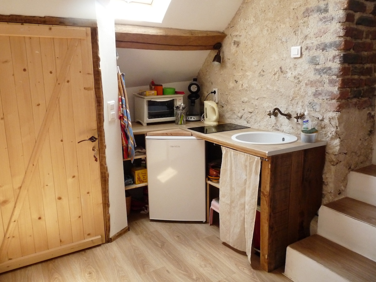 In het hart van Coëvrons in Mayenne, op 5 minuten rijden van het stadscentrum van Evron, kom en geniet van ons onafhankelijke huisje gelegen in ons pand. Dit huisje is geschikt voor maximaal 2 volwassenen en 2 jonge kinderen. Het bestaat uit een woonkamer, ingerichte en uitgeruste keuken, een slaapkamer, badkamer, apart toilet, extra bed. Uitgerust met een elektrische terminal (opladen mogelijk tegen extra kosten). Tarief: 70 EUR per nacht voor 2 personen; 10 EUR per extra persoon per verblijf.