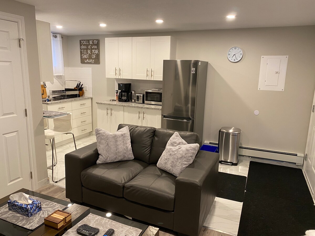 We hebben onlangs onze kelder gerenoveerd om een stijlvolle, moderne, gezellige en rustige gastsuite te creëren. Er is een zij-ingang die direct op de trap uitkomt en je naar de unit brengt. Er is een metalen buitendeur op slot voor geluidsisolatie en beveiliging. De accommodatie is een licht studio-appartement met drie grote ramen, een complete keuken, een zithoek met tv en open haard, een eettafel, een queensize bed, een inloopkast en een eigen badkamer met een douche van vijf voet. Met uitgebreide geluidsisolatie!