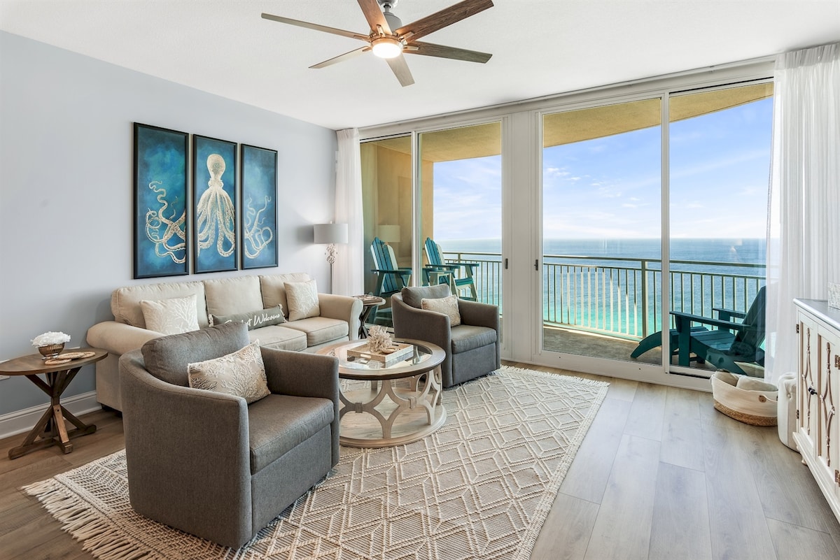 Beach Haven PCB | 1BR/2BA 8e verdieping appartement met episch uitzicht op de Golf! GRATIS strandopstelling (2 stoelen+1 parasol, mrt–okt 2026.) Stel je voor dat je op het balkon loungt, in het zwembad spettert of na zonsondergang aan het grillen bent. Supersnel wifi-systeem, 2 smart-tv's, wasmachine/droger, goed uitgeruste keuken en elektrische grill op het balkon. Bubbelbad, vuurplaats en goede vibes inbegrepen. $ 50 Resortpas (0-1 auto/per verblijf) vereist, $ 100 voor 2 apart betaald. Weekends zijn snel volgeboekt, maar we hebben geweldige weekdagtarieven!