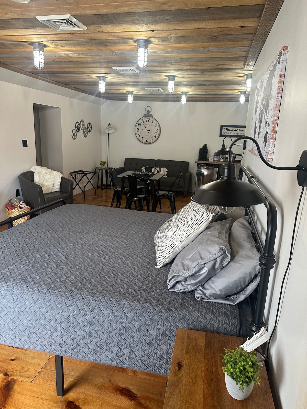 Industrial Chic style in this private studio located above a local boutique on Main St in downtown Massena. Walking distance to local restaurants, pubs/brewery, convenience store, library, salons, banks, gas stations, post office, and a quaint park on the Grasse River. Driving distance to shopping center, local beaches, picnic areas, marinas, casino, St. Lawrence River, New York Power Authority Visitor's Center, golf courses, Nicandri Nature Center, locks, St. Lawrence Seaway, and more.