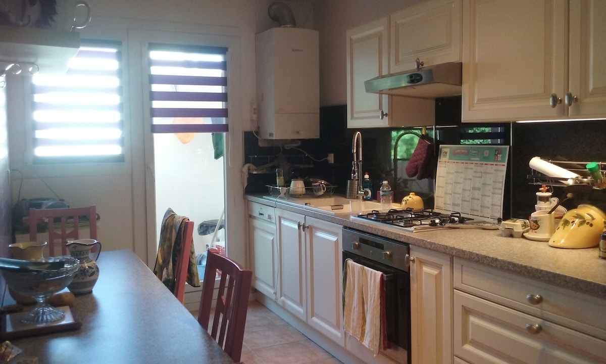 Alojamiento cerca del centro de Pau, zona tranquila, una estancia ideal para descansar, desconectar y visitar. Zona de jardin con barbacoa, garaje privado interior y aparcamiento libre exterior. Una cocina-comedor, salon con salida al jardin, tres habitaciones y un baño. Esta situado a 5 min caminando del Hipodromo de Pau y a 40 min en coche de los Pirineos Atlanticos. Dos habitaciones de matrimonio y una pequeña, tambien tenemos cuna y trona para los pequeños. Supermercados cercanos.