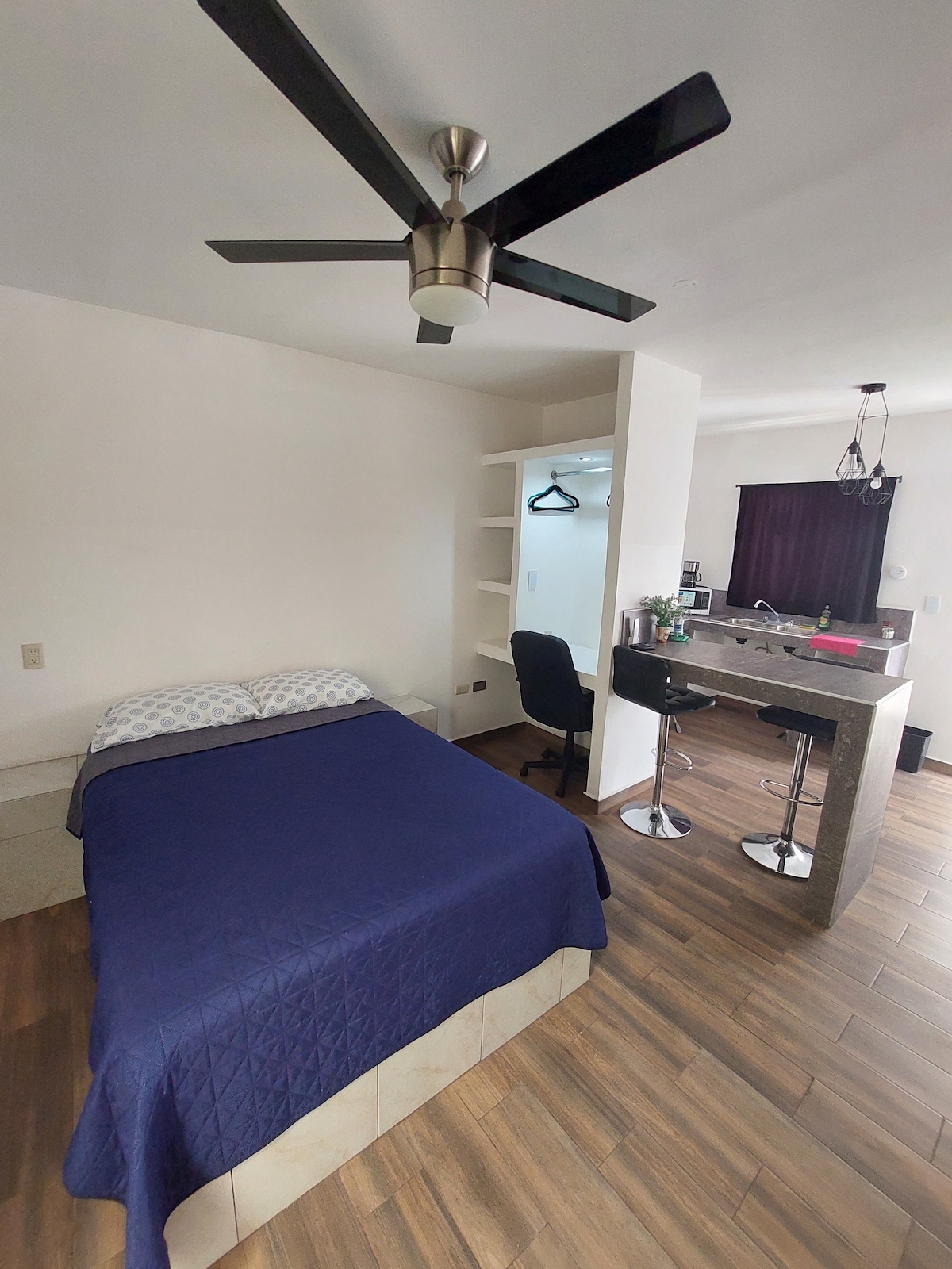 Nuevo y cómodo departamento tipo studio en planta alta ideal para 2 personas. Se encuentra ubicado en una buena zona de la ciudad, muy cerca del hospital ISSSTE, IMSS, laguna del Náinari, farmacias, transporte público y tiendas de autoservicio. Agradable lugar para una estancia tranquila y segura. Se accede con una cerradura wifi, por lo que se le entrega su código de acceso y código para recoger sus llaves. Contamos con alumbrado y cámaras de seguridad para el estacionamiento en la calle.