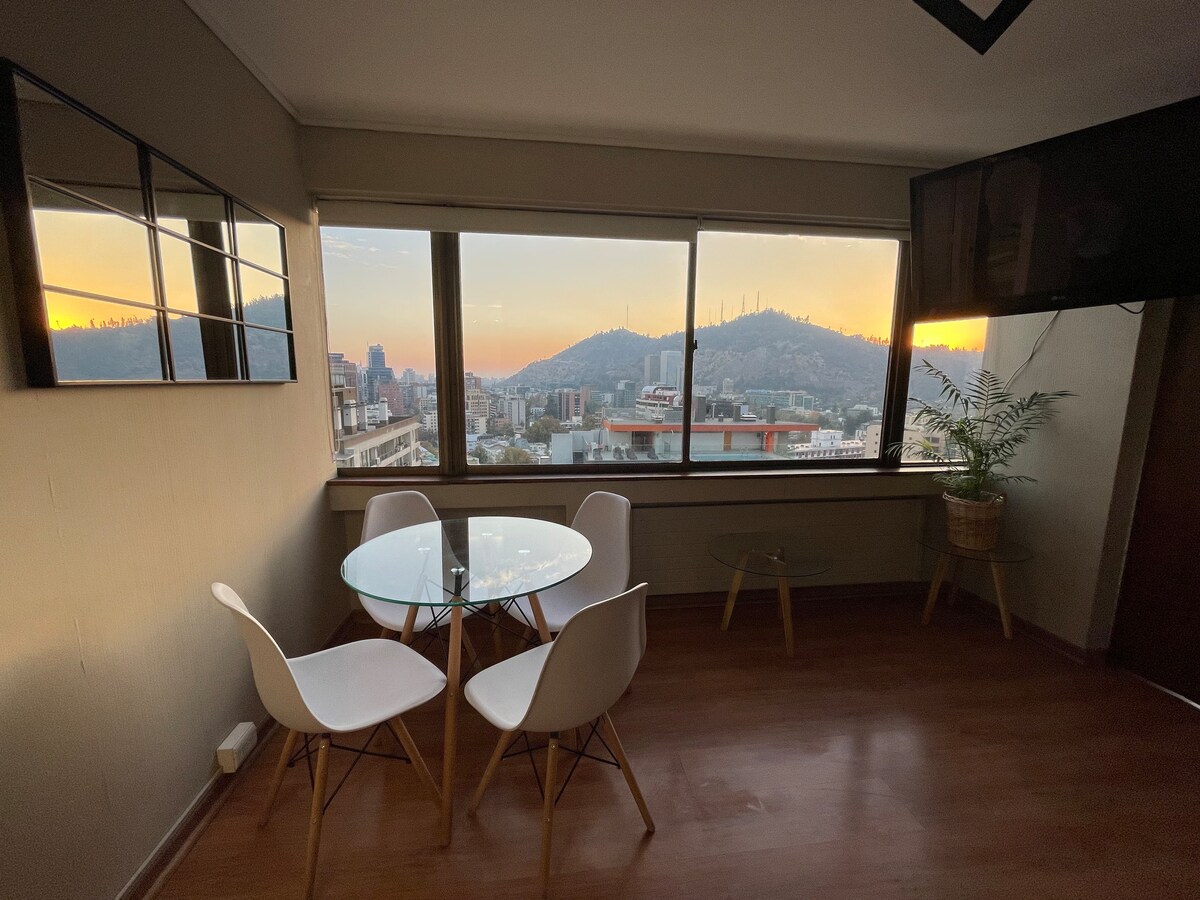 Het appartement ligt op de negende verdieping en heeft een bevoorrecht uitzicht op het westen. Het heeft een onoverwinnelijke locatie in het hart van Providencia, op steenworp afstand van het winkelcentrum "Costanera Center" en op slechts twee blokken van de metro Los Leones. De plek is omgeven door restaurants, theaters, pubs, cafés, apotheken, boekhandels en kunstgaleries. Het is gelegen tegenover het Sculpture Park, dat via een fietspad naar het centrum van Santiago via Balmaceda en Forestal Park verbindt.