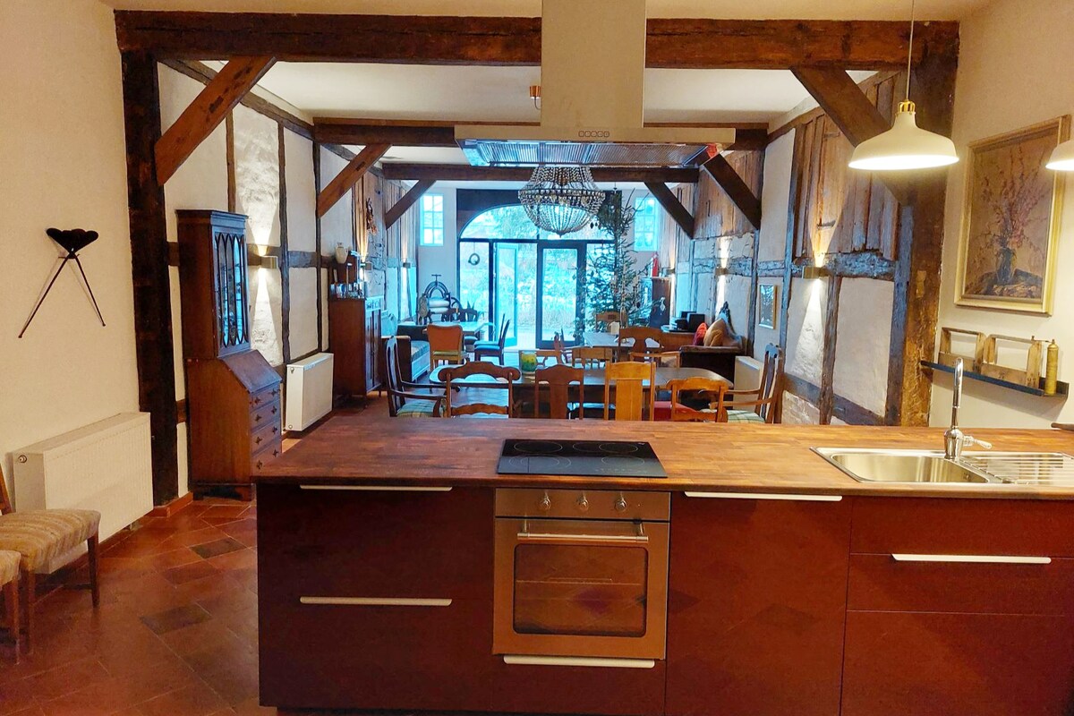 Dit historische gebouw is een typisch Noord-Duitse Bauernkate en staat aan de rand van een klein dorpje met vrij uitzicht op het heuvelachtige landschap. Naar de eigen weide achter het huis grenst aan ons 2 ha grote natuurlijke perceel, met veel gezellige plaatsen onder de bomen en aan de beek. We hebben de cate gerenoveerd met natuurlijke materialen en comfortabel uitgerust, bijvoorbeeld met een open haard en een kleine sauna.
