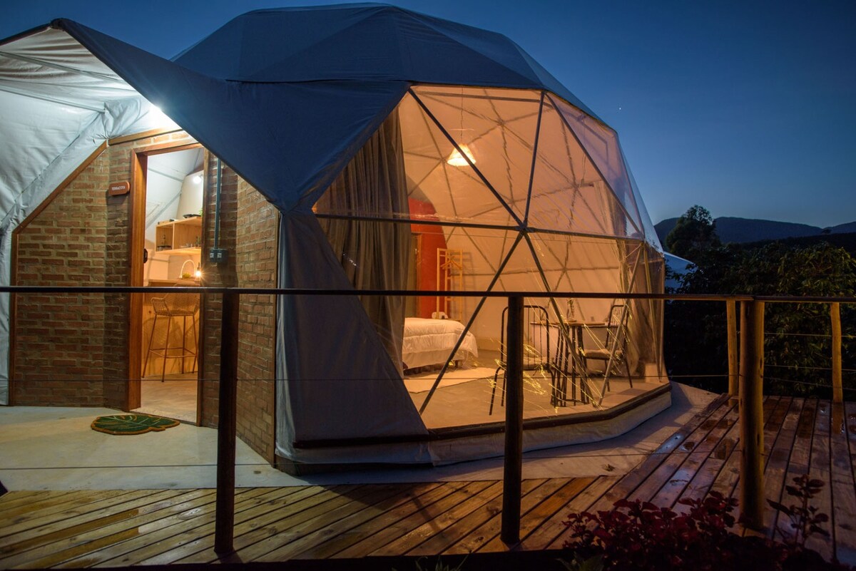 O Glamping Caparaó oferece uma experiência inesquecível de hospedagem. Localizado em meio a uma fazenda de café, a 4 km da Portaria Capixaba do Parque Nacional do Caparaó, é ideal para amantes da natureza, trilhas e cachoeiras. O domo Terracota tem 38m²,TV 4K de 50 pol, minicozinha equipada, ar-condicionado quente e frio, banheira de hidromassagem, bancada para refeições e mesa que pode ser utilizada para trabalho home-office, além de um deck com uma vista espetacular para montanha e nosso rio.