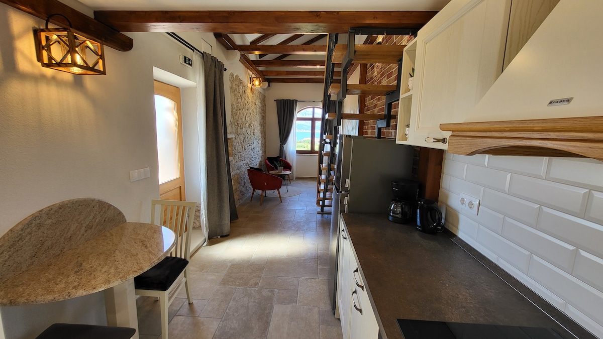 This accommodation is located in one of the first few houses built in Lumbarda, it is known that it could be from the 15th century. The house is from a family inheritance and has been newly renovated piece by piece.This beautiful open space studio offers a beautiful view of the Pelješac Channel, the vineyards of Grk and Plavac. It is 300m away from the most popular sandy beach of Pržina, a 5-minute walk.