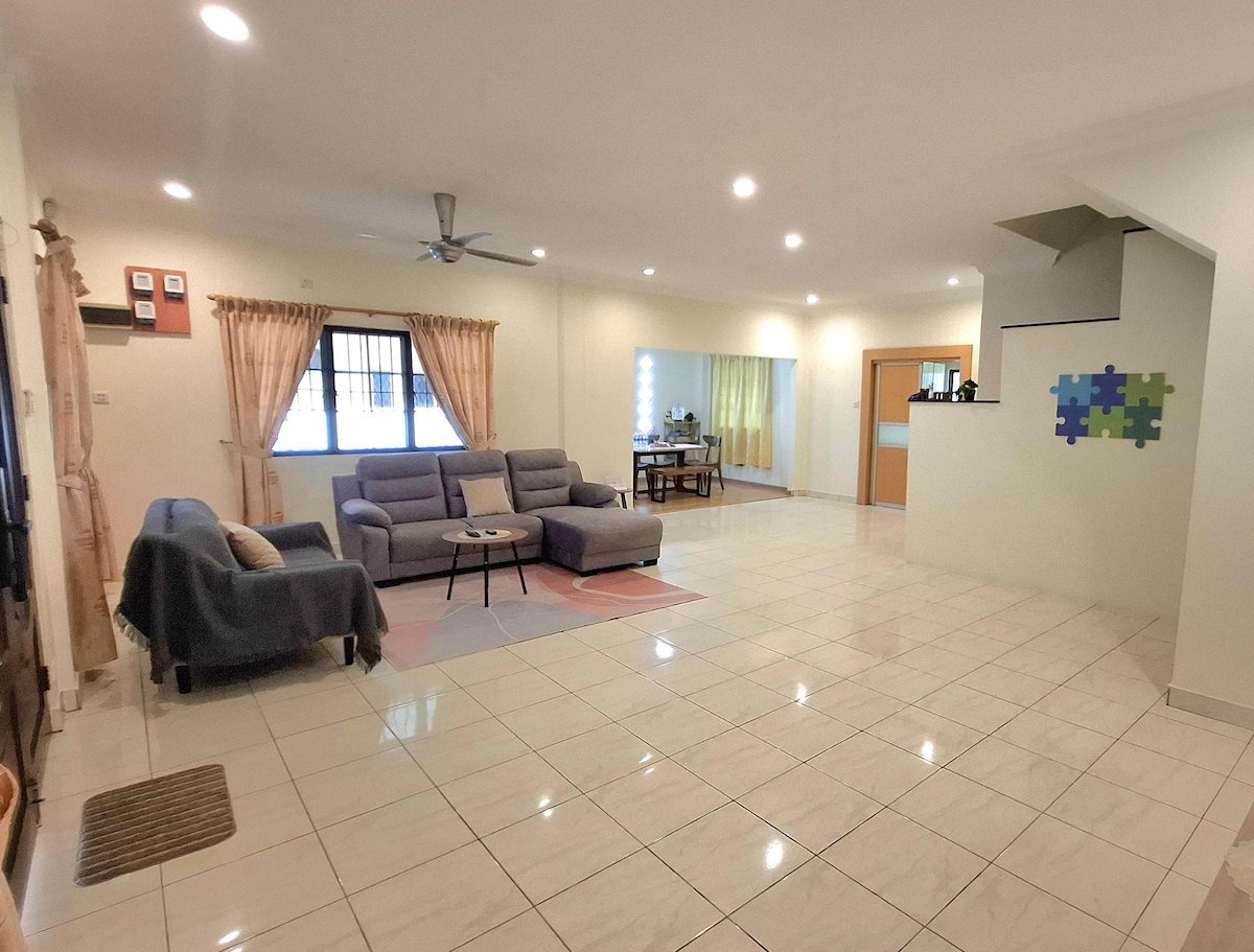 Family-Oriented & Spacious intermediate corner double-story home, perfect for a large family or group of friends with 3 bedrooms. Bedrooms (sleeps 7+): Bedroom 1: 1 Queen & 1 Single bed Bedrooms 2 & 3: 2 Single beds each. 1 Portable mattress available. Amenities: 55" TV with Netflix & YouTube 10 kg washing machine 2 Doors refrigerator Kitchen for light cooking (with induction stove, microwave oven) All bedrooms are air cond Hot water shower Board games Parking for 3 saloon cars