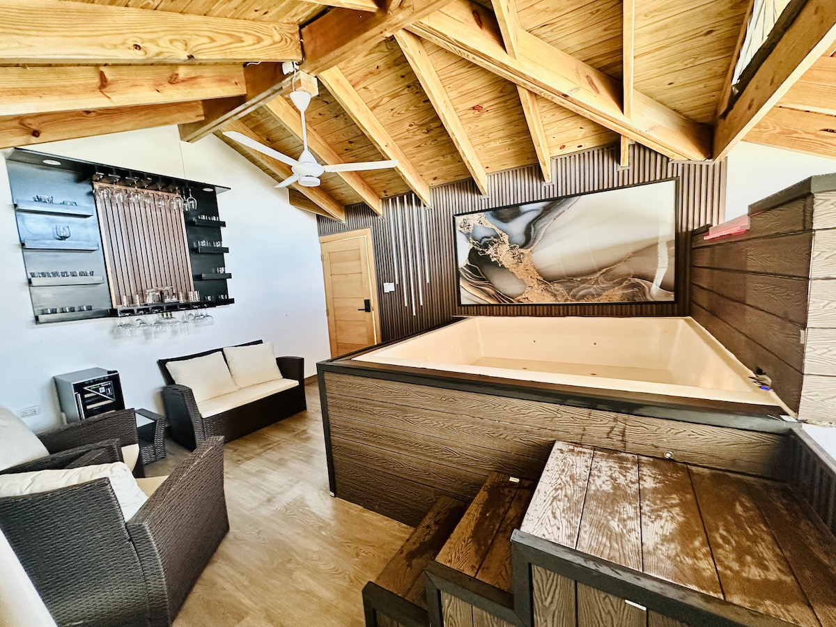 bienvenidos a Alpina House, una cabaña alpina en Pedro García con vistas al río. Cuenta con cama king-size, balcón privado, cocina equipada, Wi-Fi y aire acondicionado. Ideal para escapadas románticas o descanso en la naturaleza. Cerca hay senderos, paseos en bicicleta y opciones gastronómicas. ¡Vive una experiencia única en un entorno tranquilo y acogedor! jacuzzi climatizado. y tina de baño con una acogedora sala en el segundo nivel, ven y vive la experiencia de este mágico lugar...