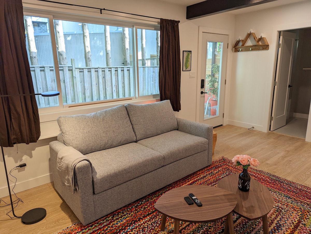 Deze eigen, open suite is gemaakt van mijn voormalige yogastudio in ons familiehuis, waarbij materialen waar mogelijk worden hergebruikt en hergebruikt. Warme teruggewonnen hardhouten vloeren leiden naar een terras aan de rand van het Princess Park-bos, met een zalmbeek die naar het westen loopt. Dieren in het wild passeren vaak — wasberen, uilen en soms zelfs een beer. Een deel van de beste mountainbikes van de North Shore is slechts een blok verderop. Een rustige, unieke plek om tot rust te komen, privacy te hebben en de natuur te ervaren.