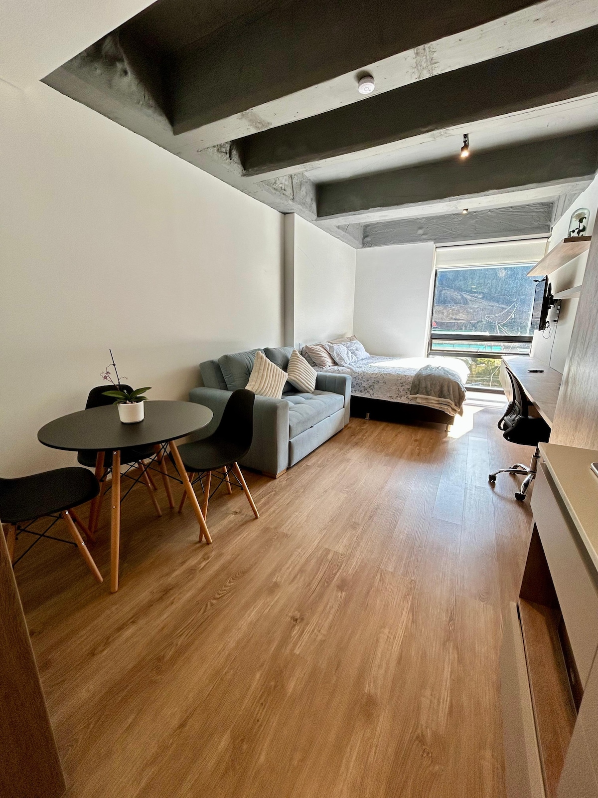 Moderno apartaestudio en los cerros orientales, al norte de Bogotá, jacuzzi con vista panorámica a la ciudad. Ubicado cerca del centro empresarial North Point, en un conjunto moderno, seguro y completo, con terraza BBQ, gimnasio, ping pong, co-working y zona de boxeo. Además, comercios y bancos cercanos. Un refugio de lujo en un entorno urbano exclusivo.