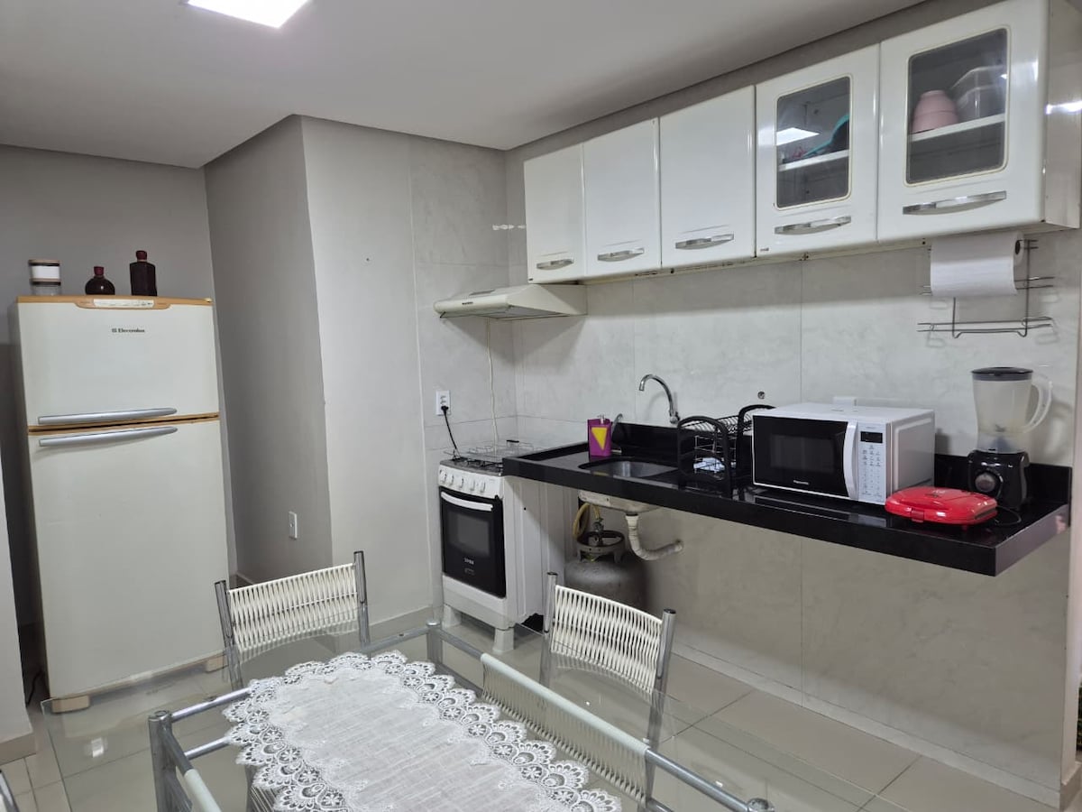 Acomodação confortável para até 5 pessoas, prática e muito bem localizada você estará a poucos minutos do centro, aeroporto e cercado por padarias, restaurantes, farmácias, sorveterias e muito mais O ambiente é completo e equipado para te receber com conforto: 🛏️ Cama aconchegante 📶 Wi-Fi 🫧Máquina de lavar ❄️ Ar-condicionado ☕ Cozinha com utensílios 🧺 Toalhas e roupa de cama 🧼 Ferro de passar disponível 📺 Televisão disponível Tudo pensado para que você se sinta em casa