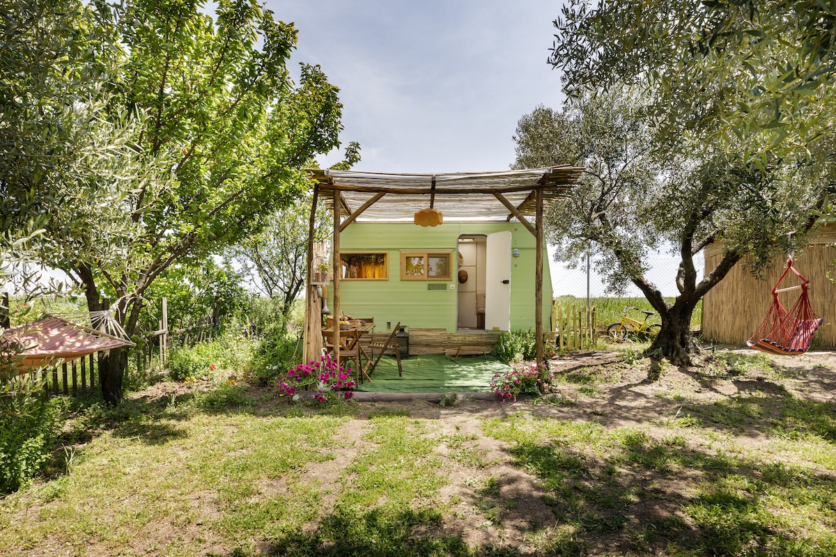 Luxurious Caravan στο Μεσημέρι Θεσσαλονίκης μεσα σε εκπληκτικό ελαιώνα, σε απόσταση 10 λεπτών από κοντινές παραλίες της περιοχής με αυτοκίνητο. Το Caravan διαθέτει 1 διπλό κρεβάτι, 1 μόνο κρεβάτι ,κουζίνα, ψυγείο,κλιματιστικό και δίπλα της υπάρχουν ιδιωτικός χώρος μπάνιου και έπιπλα εξωτερικού χώρου(τραπεζαρία-αιώρα κτλ).Είναι πλήρως επιπλωμένο και διαθέτει όλες τις ηλεκτρικές συσκευές. Το κατάλυμα βρίσκεται σε ένα κοινόχρηστο κτήμα 5,5 στρεμμάτων με ελαιώνα,αμπελώνα και μια μικρή φάρμα ζώων.
