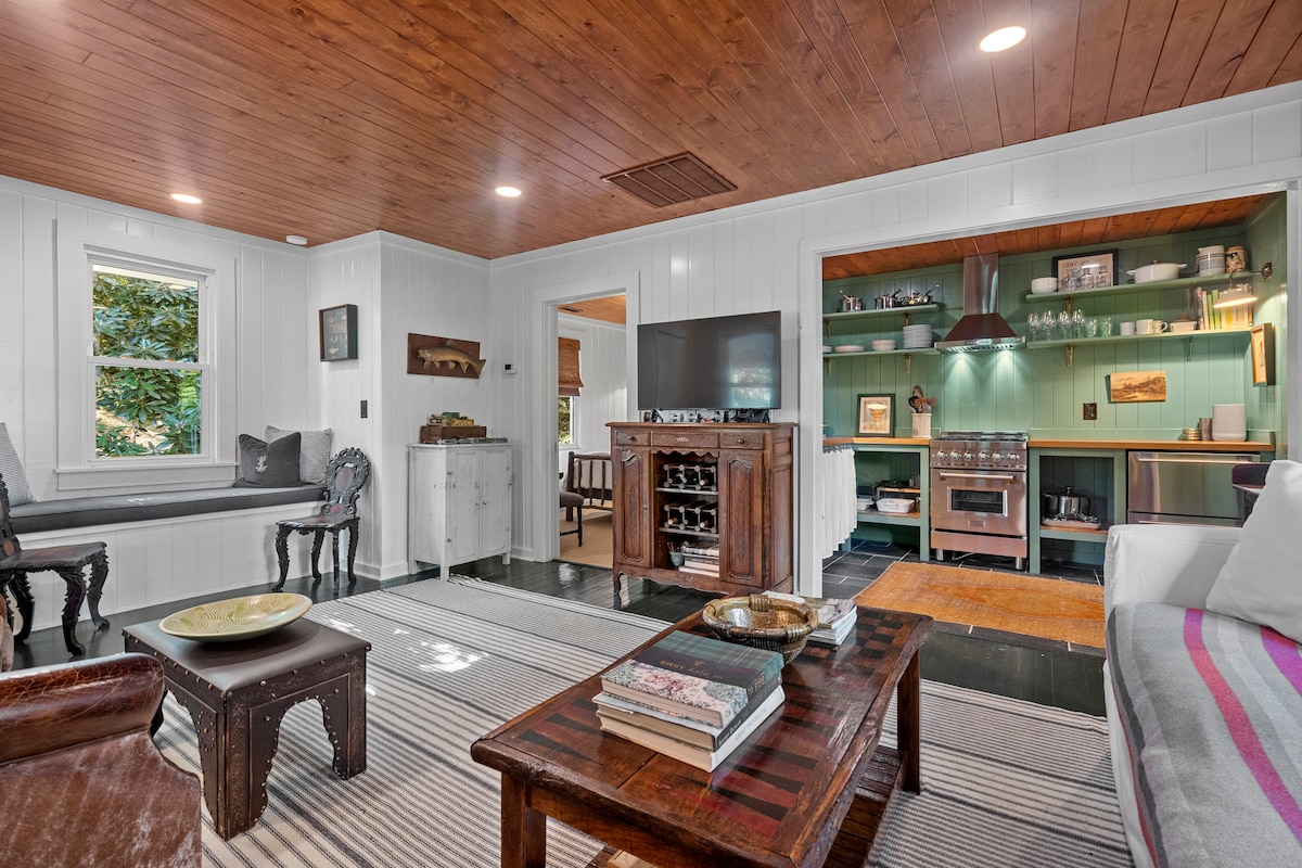 At 4000+ feet & only a 10 min walk to town on the Rhododendron Trail. Totally renovated 2017!! Light & sunny 3 bed/2 bath, 750 sq. ft. Originally built by my wife's g-grandmother in the 1940's. Floor to ceiling shiplap, 17 ft. ceilings, hardwoods, reclaimed barn wood, custom fixtures, heated marble/slate bath floors, tankless water heater, gas fireplace, porch, Wifi, TV, washer/dryer, kitchenette. Beautiful gardens! Classic Highlands charm with modern comforts! Hike, fish, shop, or relax!