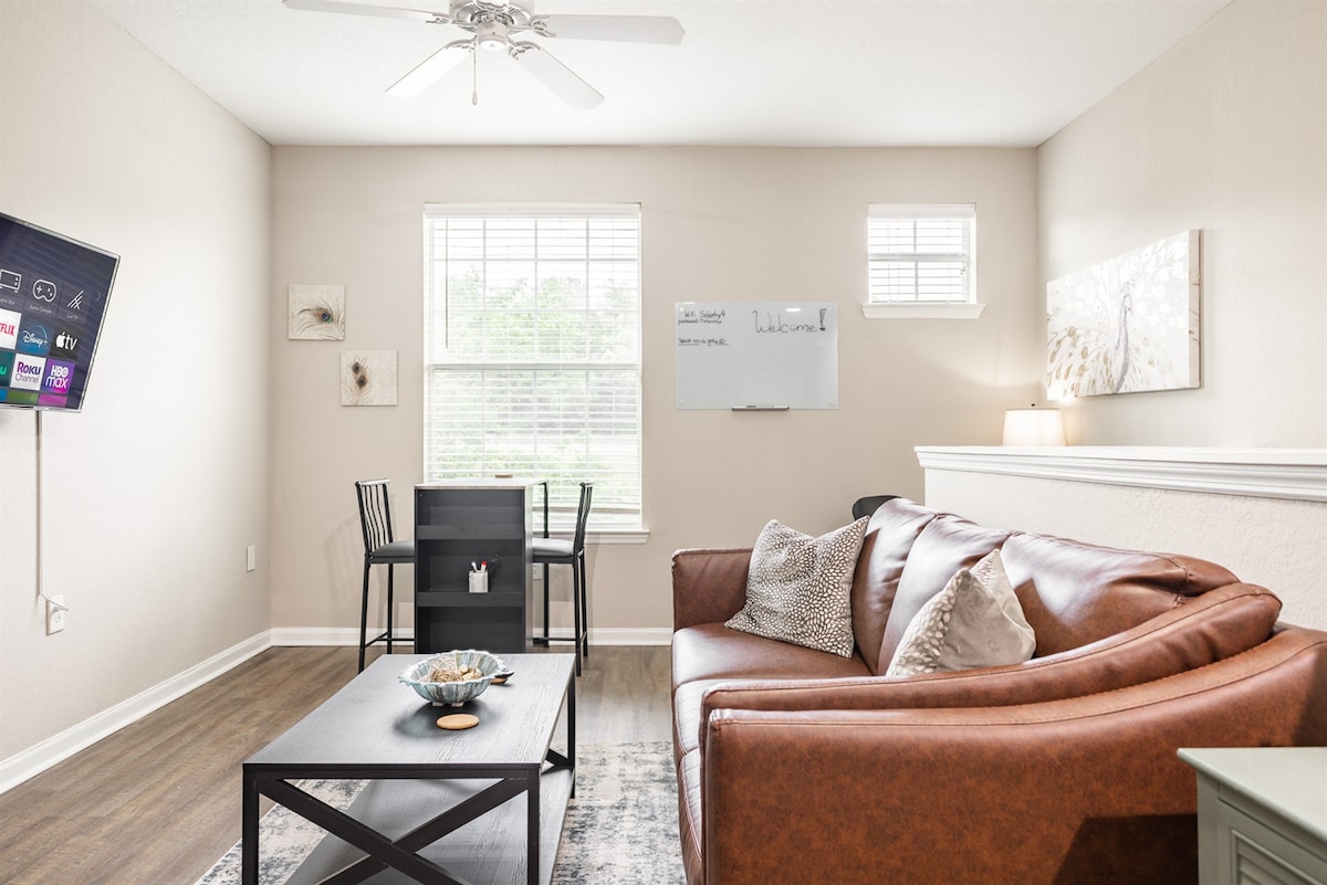 Ons appartement met 2 slaapkamers en 2 volledige badkamers is ingericht met een kingsize bed in de primaire kamer en een queensize bed in de secundaire kamer met 43 inch smart-tv 's in beide slaapkamers. De gemeenschappelijke ruimte heeft een 50' smart-tv, eettafel voor 4, love seat en 2 accentstoelen. Het heeft alles wat je nodig hebt voor een comfortabel verblijf! De keuken is gevuld met kookgerei voor maaltijden, koffie en theezetapparaat om te genieten van een vers kopje koffie of thee. Alles in het appartement is voor jou. Doe alsof je thuis bent als je er bent.