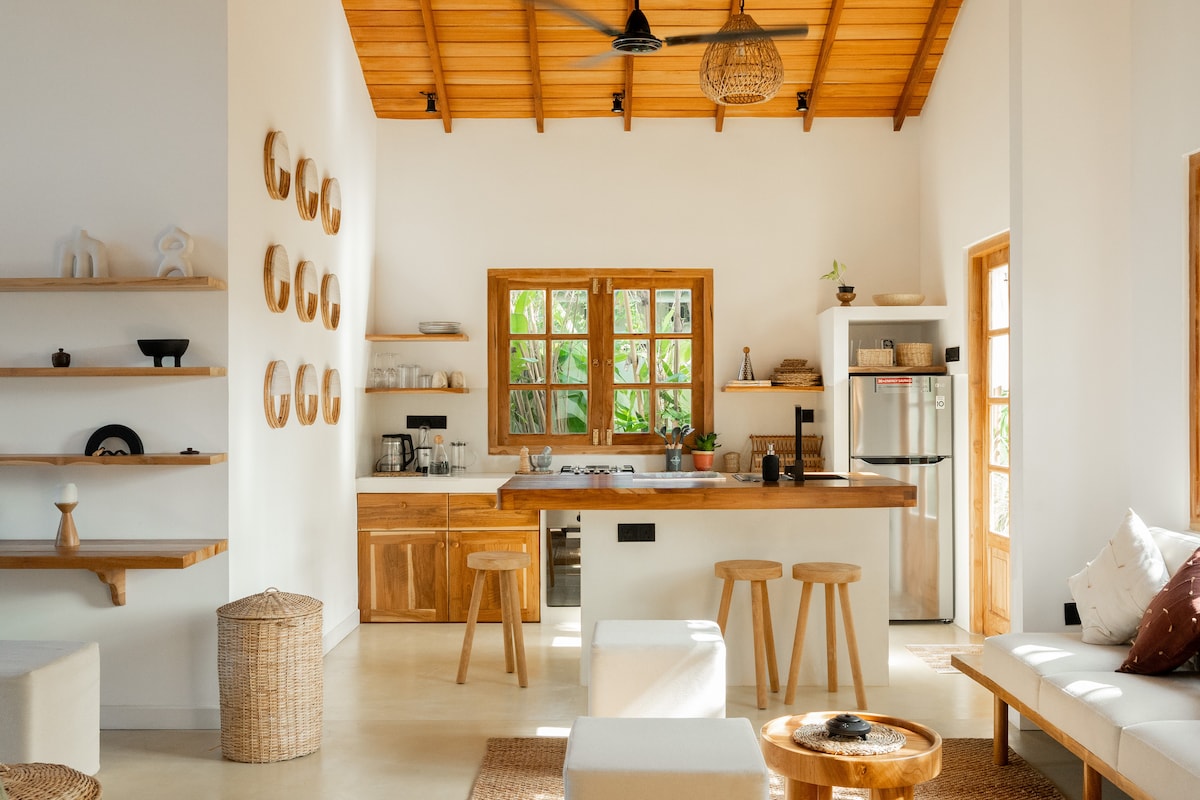 Ervaar een bloeiend ecosysteem van fauna, bloemen, vogels en vlinders. We hechten waarde aan veiligheid, privacy, comfort en veel water. Voldoende ruimte om naast elkaar te bestaan, te chillen en te creëren, muziek te spelen of yoga te beoefenen en te slapen. Opzettelijk ontworpen met behulp van thunbergia + passievruchtstokken voor schaduw en het koel houden van woonruimtes, natuurlijk zonder zonlicht op te offeren. Geniet van de tuin, kokosnoten en bananen en zie van dichtbij inheemse bijen.