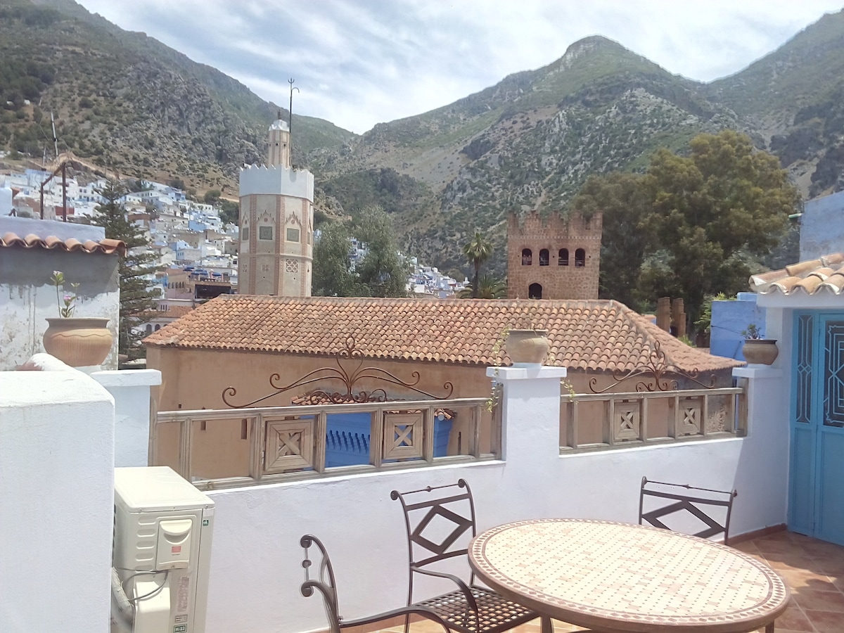 Mooi huis gerenoveerd in 2016, gelegen in een van de ingangen van het Outa El Hammam plein, het centrum van het leven in Chefchaouen. Het huis ligt recht tegenover de Centrale Moskee en de Kasba van Chefchaouen. Naast het huis vind je allerlei diensten (winkels, restaurants, geld wisselen, geldautomaat,...). Het huis heeft een gedeeld terras met een ongelooflijk uitzicht, vanwaar je de toekomst van het chaouni-leven, de indrukwekkende bergen en de hele vallei kunt observeren