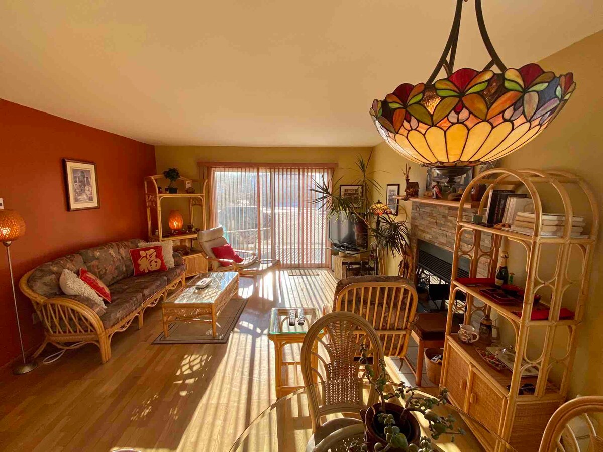 This is your lovely vacation home in the beautiful Eastern Townships area. It's a cozy condo with 1 bedroom of a queen bed and 1 floor mattress in the living room. Perfect for couples, solo travelers and families (with children). Only a couple of mins walking from Lake Memphremagog, and 5 mins driving from Mont Orford Ski Resort. Free WiFi and Free Parking. Wood floor, full kitchen, 1 bathroom/amenities, washer, dryer, dishwasher, wood burning fireplace, big terrace and BBQ.