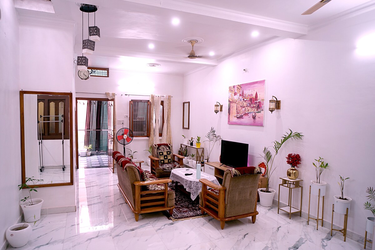 Welcome to our beautiful vintage-themed 2BHK in Varanasi Perfect for families and pilgrims seeking a clean, peaceful and comfortable stay after temple and ghat visits. Decorated with vintage and rustic furniture. Enjoy AC rooms, fast WiFi and a relaxing living area in a well-maintained home.” Authentic Banaras experience, the home blends traditional character. Prime Location • Just 7-10 mins ride to Kashi Vishwanath Mandir. • Only 7-10 mins ride to Dashashwamedh Ghat Available-OLA & UBER.