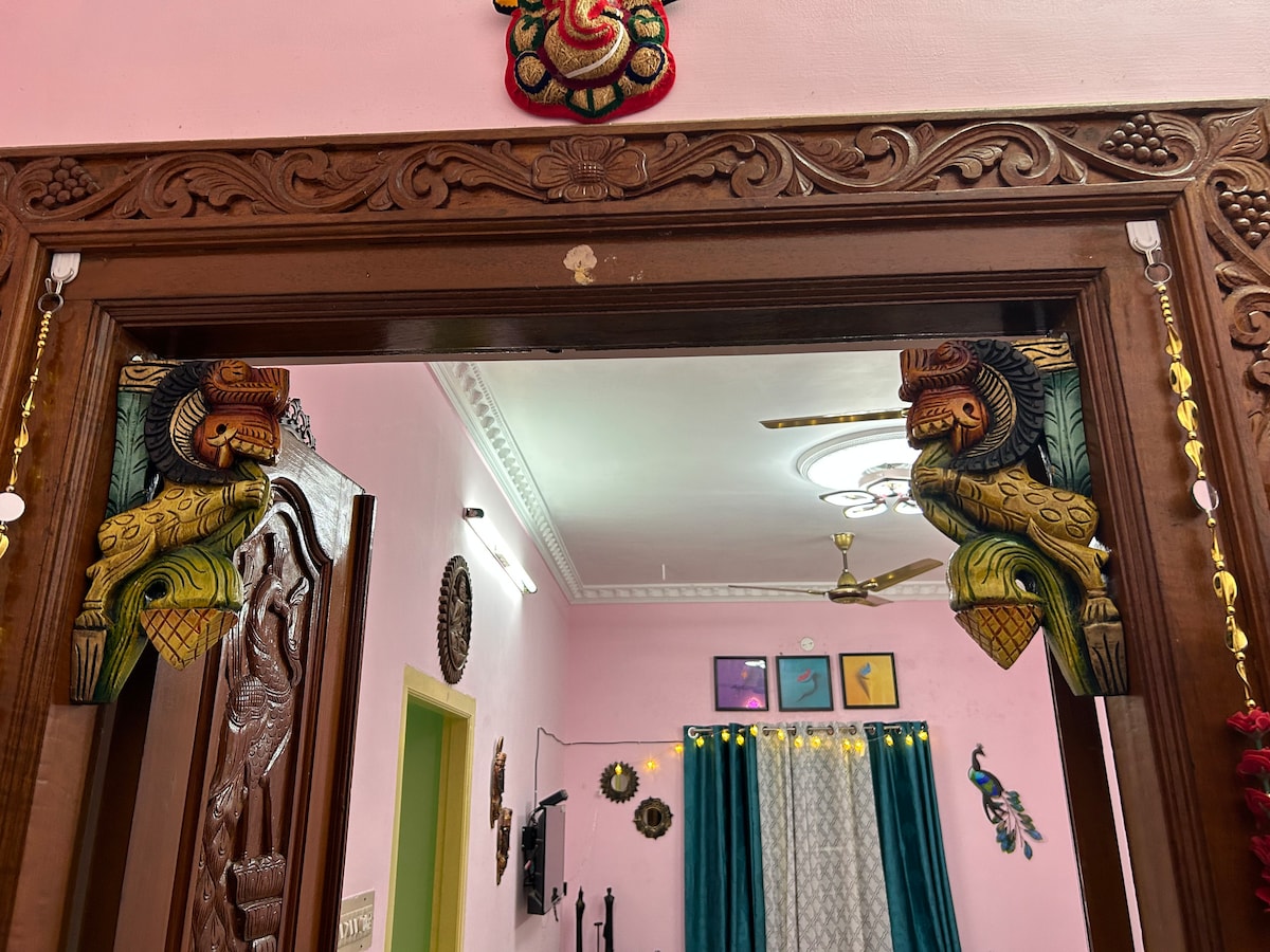 Ervaar het rijke culturele erfgoed en de tijdloze charme van Karaikudi in onze unieke Airbnb-advertentie. Ons huis biedt een mix van traditionele en moderne inrichting. Of je nu een liefhebber bent van geschiedenis, een liefhebber van eten of gewoon op zoek bent naar een rustig uitje, onze accommodatie biedt het allemaal. Ervaar de warmte van Chettinad gastvrijheid en het creëren van blijvende herinneringen.