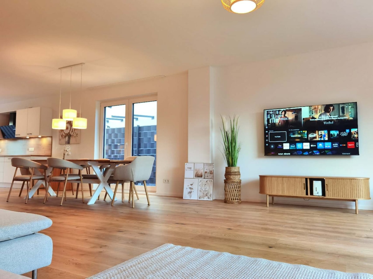 NEST NO.1 - a bright ambience in a clear feel-good design. On more than 110 sqm the guest can expect a spacious dining area, 2 cozy bedrooms with large double bed, a sunny kitchen, a daylight bathroom and a separate guest toilet. Our large living room invites you to linger on the large sofa. The terrace with a small garden offers additional space and in the evening you sit there and enjoy the last ray of sunshine and let the day end. Frankfurt airport: 28km, Frankfurt fair 37km.