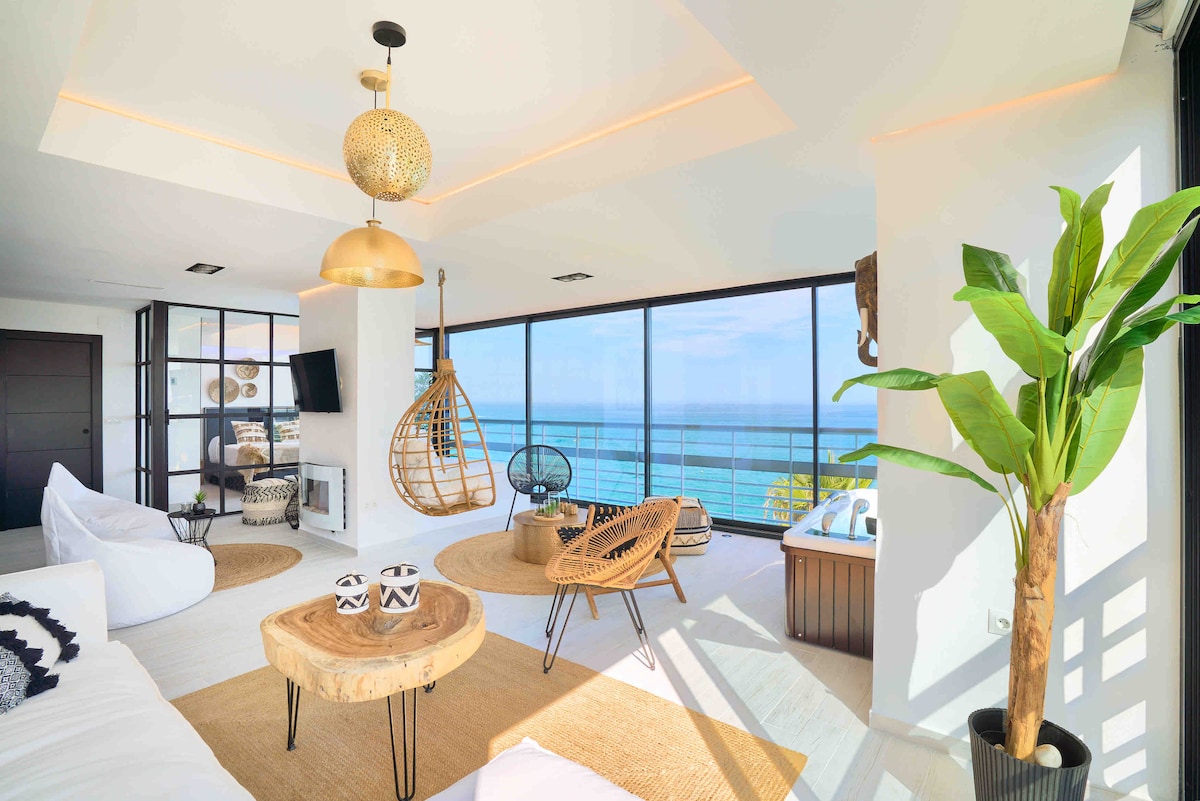 Despierta con las olas del mar y el mejor amanecer que puedas soñar. Túmbate en la cama balinesa mientras divisas el mar infinito o sumérgete en el Jacuzzi climatizado mientras te tomas una copa de cava. El Savanna Beach está pensado para pasar una vacaciones relajantes en un lugar mágico y con encanto. Decorado en un estilo boho, natural y étnico. Acceso directo a la conocida playa de Bajondillo a través del ascensor privado de la urbanización y a 4 minutos a pie del centro de Torremolinos.