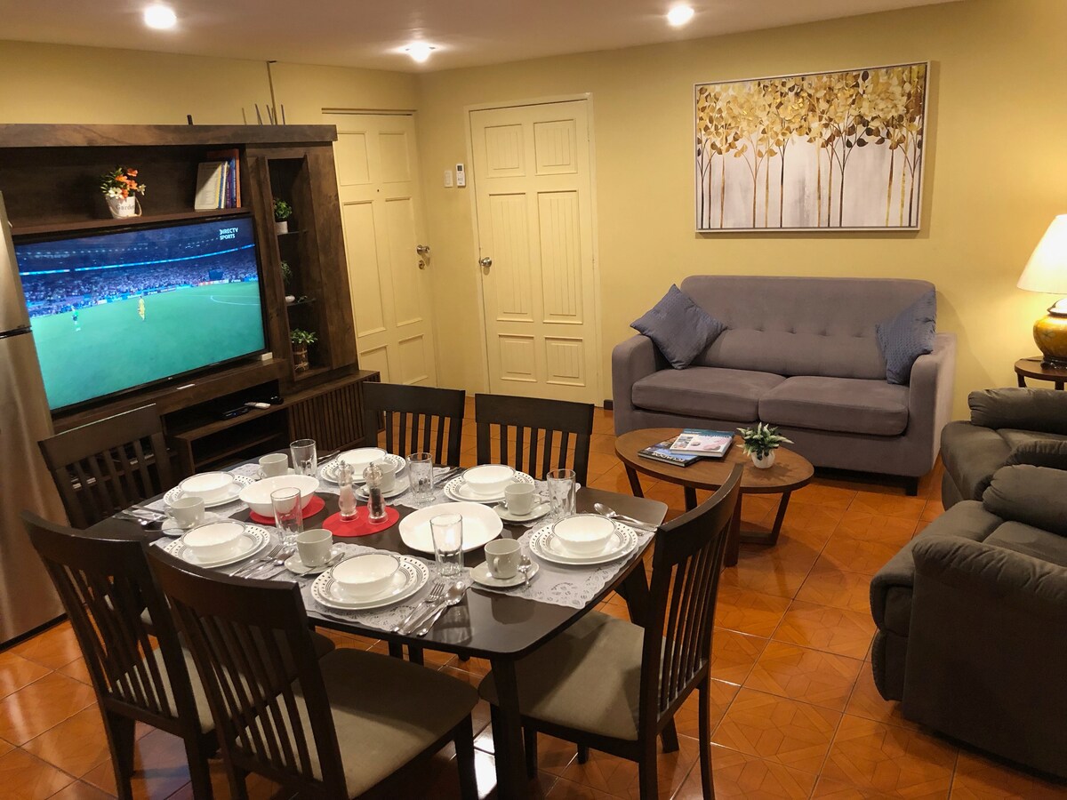 - 100% privé - Overdekte tuin - 17 minuten van consulaat Americano, 12 minuten naar Aeropuerto, 7 minuten naar Sanmarino - een queensize bed + een slaapbank - 2 smart-tv's en internet - keukentje - Inchecken: 15.00 uur Uitchecken: 11.00 uur - Cédulas/paspoorten vereist - Gratis privéparkeergelegenheid op Plaza Guayarte, voor het condo, beschut. Keer: Zondag tot vrijdag: open 06.00 uur, sluit 00.00 uur Vie y Sat: open 06.00 uur sluit 01.00 uur - Parkeren zonder voogd: Tegenover de voordeur. (1 ruimte)
