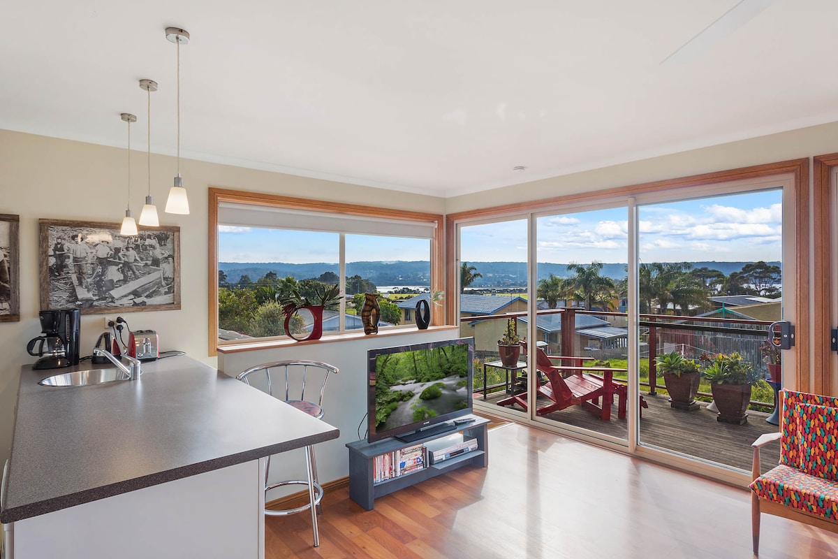 Ontsnap naar een gezellig toevluchtsoord met twee slaapkamers, uitzicht op het meer en kamerhoge ramen. Perfect voor surfers, vissers en natuurliefhebbers, je wordt omringd door kookaburras, kangoeroes, wombats en een inwonende koala. Dit is het perfecte moment voor een bezoek: als je geluk hebt, zie je misschien migrerende walvissen langs de kust, een glimp opvangen van het zuidelijk poollicht vanaf het nabijgelegen strand en genieten van de magie van bioluminescentie die langs de stranden en de rivier gloeit. Een rustige, onvergetelijke accommodatie.