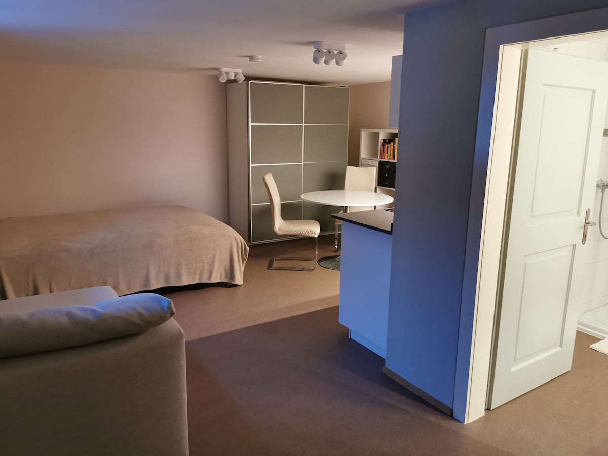 Even weg van de drukte en toch dichtbij. Onlangs gerenoveerde studio voor weekenden, korte of lange vakantiegangers, paddenstoelenverzamelaars, spoorwegliefhebbers.... In 5 minuten met de postbus en winkels, winkels op de binnenplaats om de hoek. Kitchenette met vaatwasser en oven. 1 tweepersoonsbed, 1 slaapbank. Wasmachine voor gedeeld gebruik tegen betaling op afspraak in het hoofdhuis. Parkeren: voor laden en lossen bij het huis, gratis parkeren op 5 minuten. Huisdieren zijn welkom als ze katvriendelijk zijn.