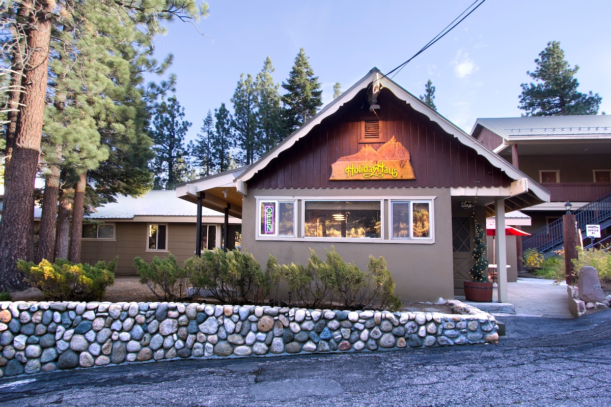 ** NO CLEANING FEE The Mammoth Chalet is the ultimate lodging facility with two bedrooms (one King bed in each), and a fold out sofa couch in the living room. Two baths, spacious living area, a dining area and kitchenette (NO stove/oven) are included in this spacious Chalet. Sleeps up to 6 people. Please Note: Holiday Haus is 100% smoke free, portable cooking devices are strictly prohibited and we do not allow pets. TOT (tax I.D. 5097)