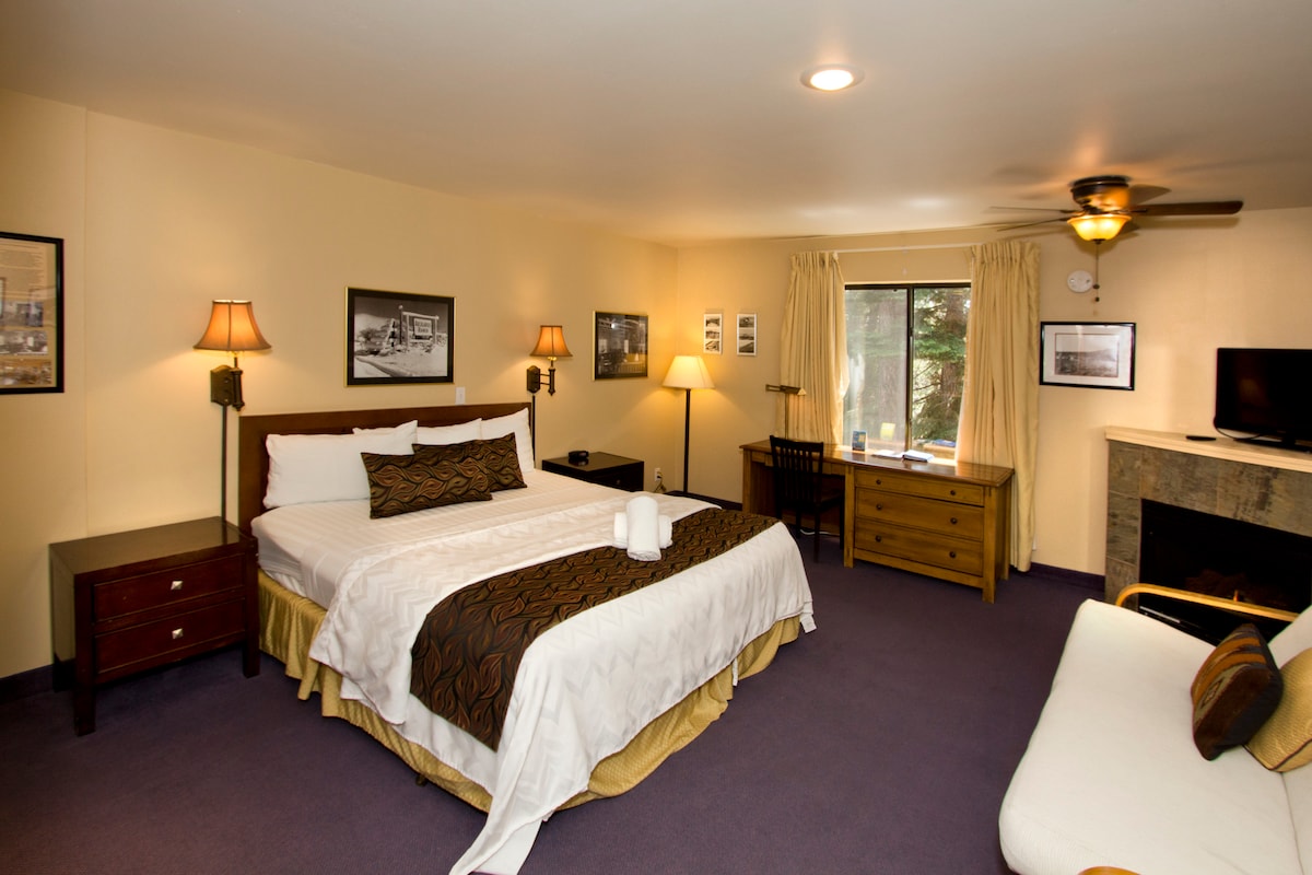 ** NO CLEANING FEE This room sleeps 2 people on a King bed. It includes a fireplace, small refrigerator, microwave, sofa and flat-screen TV with cable. This room is located on the first floor only. Please Note: Holiday Haus is 100% smoke free, portable cooking devices are strictly prohibited and we do not allow pets. TOT (tax I.D. 5097)