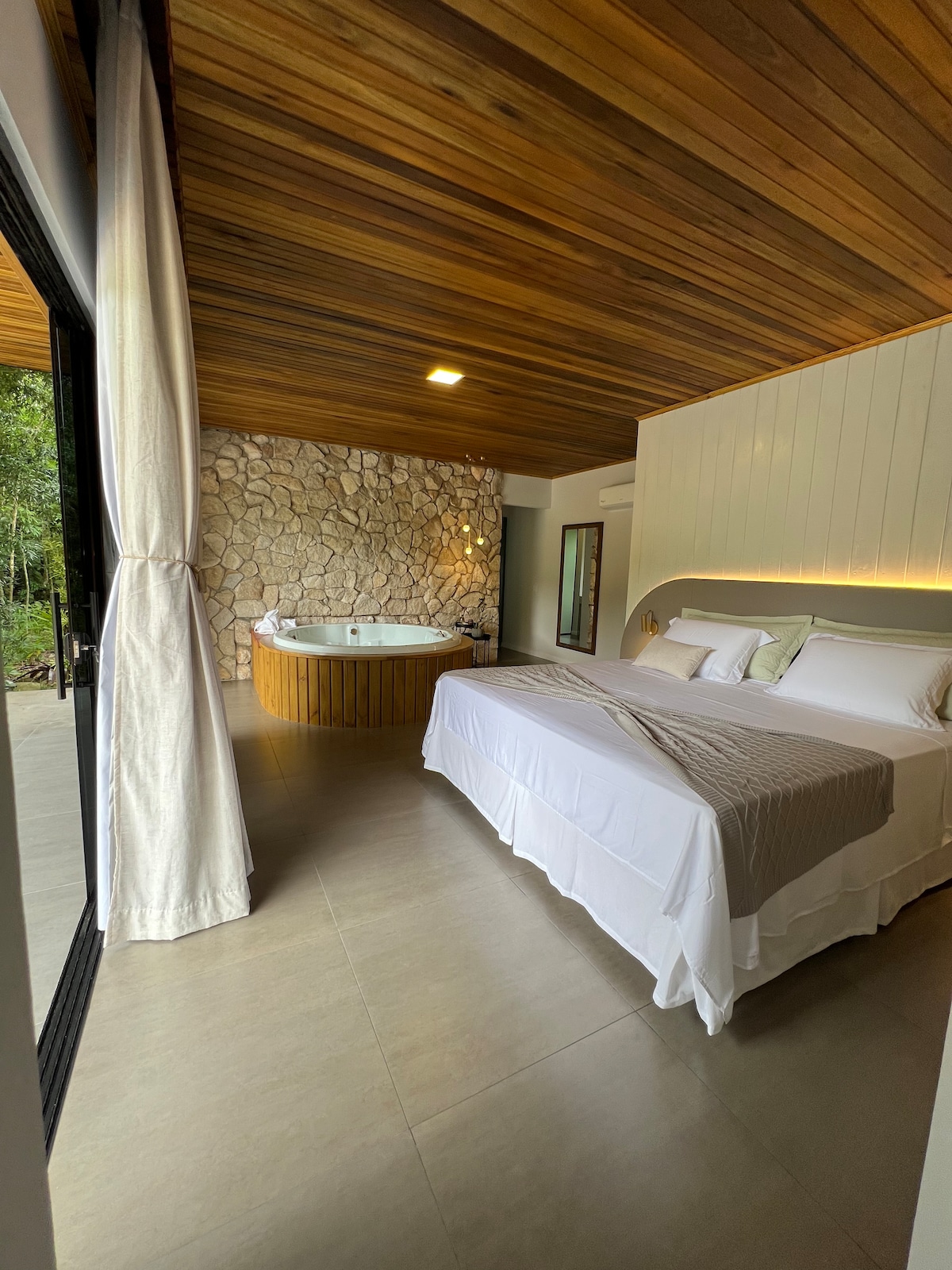 Ontspan in deze rustige, stijlvolle ruimte. Hier ben je verbonden met de natuur, zul je slapen en wakker worden met het geluid van de vogels, het geluid van het water...je zult genieten van de stralende zonsopgang op de berg, je zult het natuurlijke geluid van de nacht kunnen horen tijdens het bakken van marchmelos bij de tuinhaard. Je kunt nog steeds zien vanuit het raam, de vogels voeden zich met lokale vruchten zoals banaan, sinaasappel en wilde frambozen... je kunt in de loop van de dag het gezang van de inhambús in het bos horen.