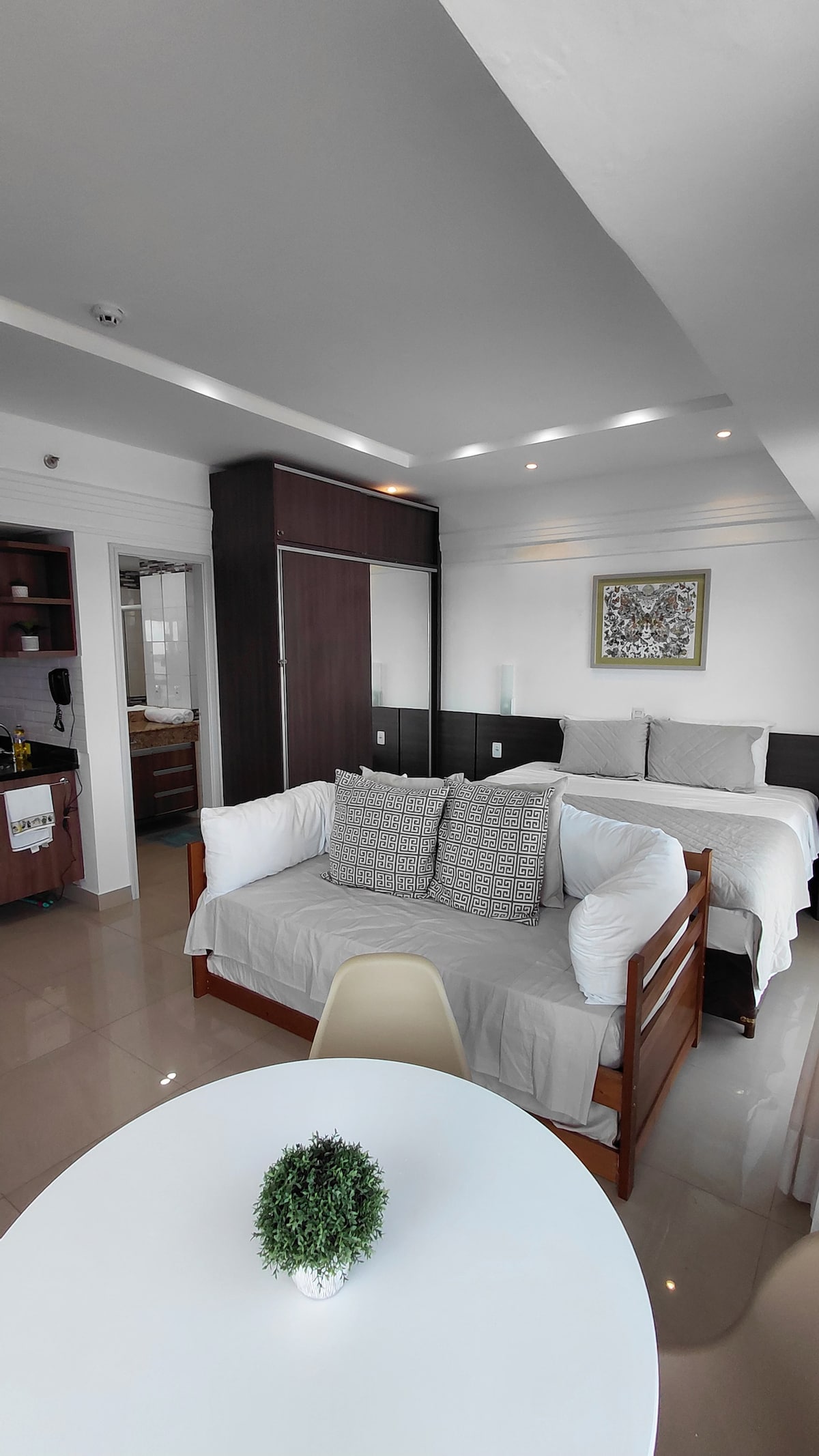 Appartement met een balkon met uitzicht op de zonsondergang en de natuur, luchtig, rustig en veilig. Altijd schoon, met nieuwe en gedesinfecteerde handdoeken en beddengoed. Uitgerust met Alexa, een volledig ingerichte keuken en gedeelde voorzieningen, waaronder een zwembad, barbecue, kleedkamer, feestkamer en speelkamer. De buurt biedt een nabijgelegen supermarkt, wandelgebied, gastronomisch plein. De beste optie voor diegenen die op zoek zijn naar gemak en nabijheid van de luchthaven. Geniet van een ongelooflijk en onvergetelijk verblijf!