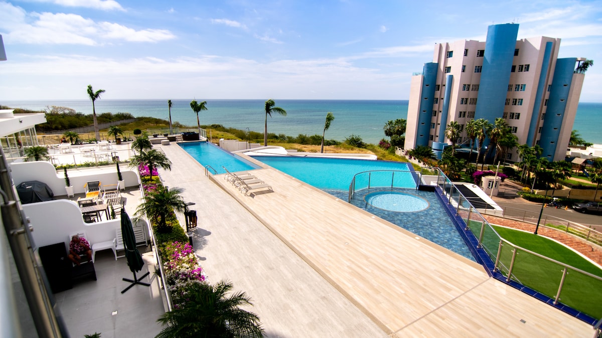 Goed uitgerust appartement met een prachtig uitzicht op de oceaan en het zwembad. Dicht bij Plaza La Cuadra, een gebied met restaurants en markt in de nieuwste buurt van Manta. 5 minuten van Mall del Pacifico en Playa Murcielago met de auto. Vanuit het gebouw kun je door het strand lopen. Familie kan genieten van zwembaden, jacuzzi, tenisbaan, fitnessruimte, speeltuin. Dichtbij dit gebied zijn er veel mooie plekken om te verkennen als Santa Marianita, Crucita, Machalilla National Park, Montecristi, enz. Welkom bij Manta!!!