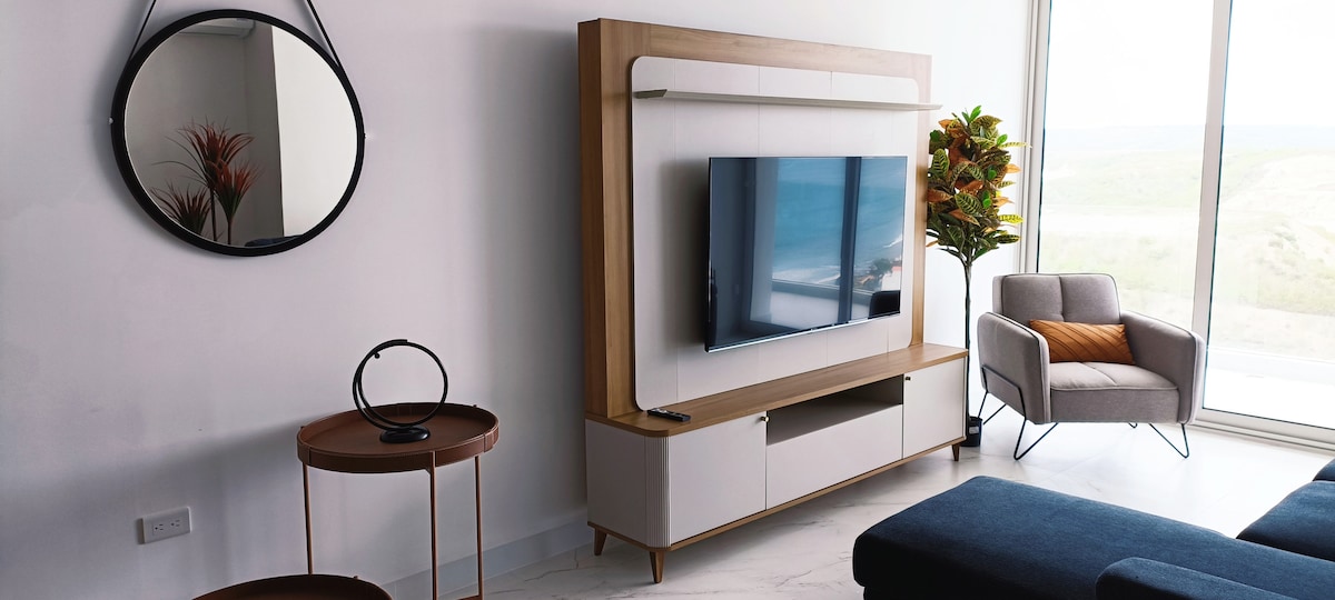 Modern appartement met zeezicht, op een steenworp afstand van El Murciélago Beach (locatie voor Ironman 70.3), Mall del Pacífico en top lokale restaurants. Perfect voor vakantie/werken op afstand met een monitor. Rustig, weg van straatlawaai. 24/7 beveiliging en snel glasvezelinternet. Voorzieningen zijn onder andere een zwembad, sauna en jacuzzi (open di-zo, het kan zonder voorafgaande kennisgeving veranderen). Het gebouw heeft een generator voor gemeenschappelijke ruimtes en een UPS houdt de wifi draaiende. Lift-, water- en internetwerkzaamheden tijdens storingen.