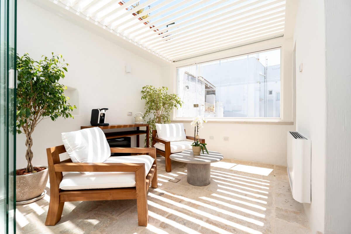 CIS: BR07401291000000188 CIN: IT074012B400033730 Vivi la magica sensazione di trovarti tra passato e presente: è una dimora storica! I pavimenti d'epoca e le pareti in pietra fanno da sfondo a un ambiente arredato con oggetti di design, vecchie ceramiche e mobili locali. L'ampio terrazzo privato, con solarium e doccia calda, saprà entusiasmarti: potrai rilassarti con un bicchiere di vino al tramonto, godere del sole su comodi lettini o preparare una cena in una magica atmosfera pugliese.