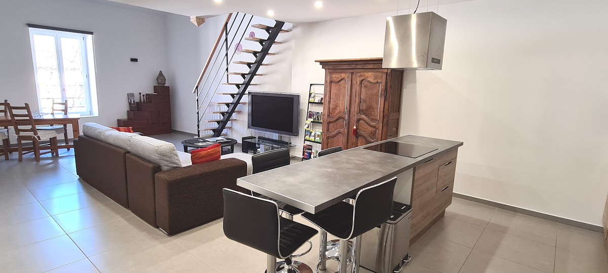 Ideaal gelegen tussen Franche-Comté en Bourgondië, duplex appartement, waaronder een uitgeruste keuken, een badkamer, een droog toilet, een woonkamer en een slaapkamer. Deze woning is gelegen in een vrijstaand huis, omgeven door een terrein van 1,5 hectare, aan de rivier . Als je van de natuur, het buitenleven en de rust van het platteland houdt, aarzel dan niet... Huisdieren zijn welkom, mogelijkheid tot accommodatie en weiland voor paarden en Anes.