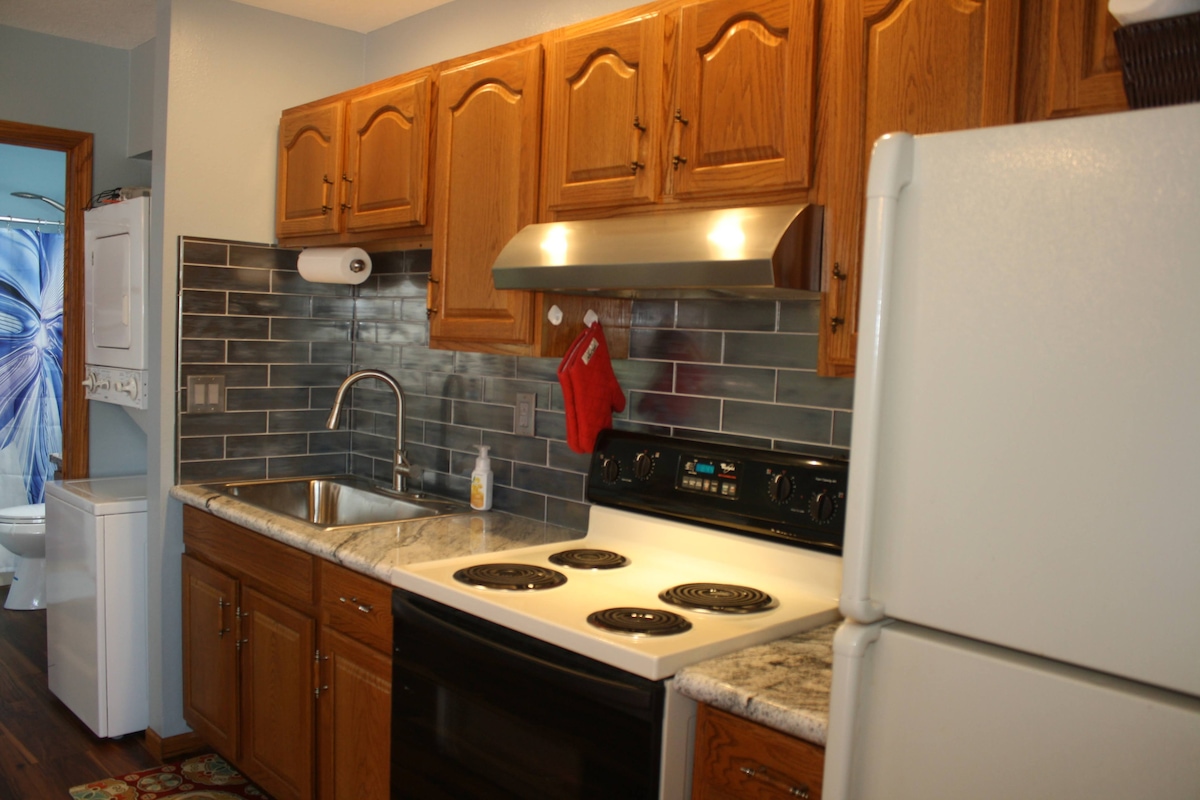 Onze geweldige 60 's Inspired studio heeft een vintage vibe uit het midden van de eeuw! Een snelle wandeling om de unieke stad Pella te verkennen. Inclusief het stadspark, historische gebouwen, restaurants, bakkerijen, vleesmarkten, winkels, Central College, bioscoop en nog veel meer om te verkennen. Dit is een tweede verdieping walk-up; je hebt een vlucht van stappen om in en uit te gaan. Eigen ingang en parkeerplaats op de oprit.