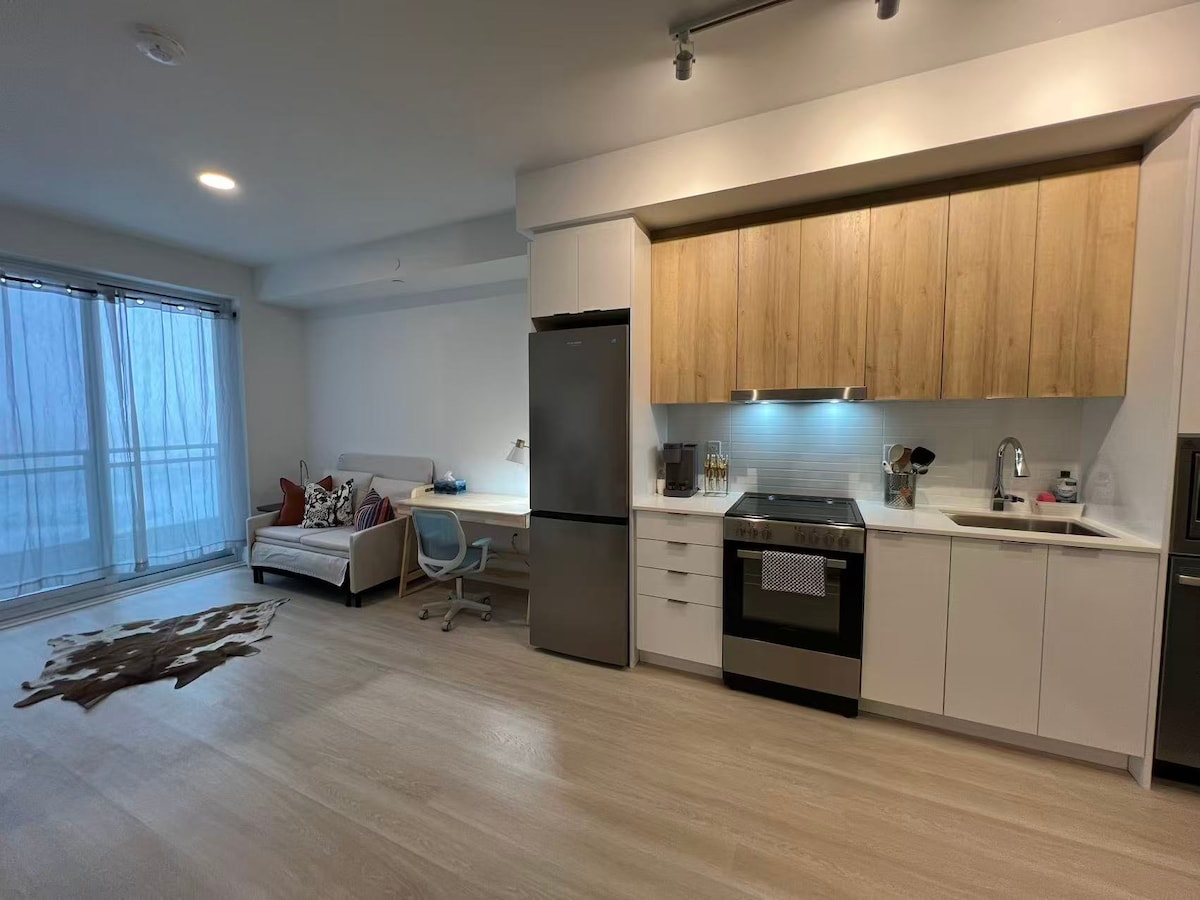 Geniet van je hele appartement bij de Morden plek. Deze gloednieuwe, ruime suite met 1 slaapkamer en 1 badkamer heeft een slim open concept dat perfect is voor professionals of koppels. Geniet van een lichte woonkamer, roestvrijstalen apparatuur en een eigen balkon. Stappen naar Mount Joy GO Station, Food Basic, Shoppers Drug Mart, One Dollar, Home Depot, LCBO, The Beer Store, cafés, restaurants en banken. Snelle toegang tot snelwegen. Gratis parkeren is mogelijk op de begane grond voor het gebouw.