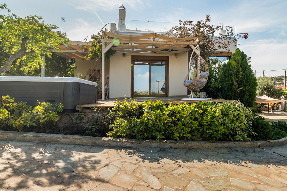 Privéwoning op 30 meter van de zee met privézwembad, een 5-persoons spa jacuzzi en geweldig uitzicht op zee vanuit alle ruimtes. Op loopafstand van lokale stranden, bars en restaurants Locatie op slechts 8 minuten van de luchthaven op 30 minuten van Athene met de auto. De eerste vier gasten verblijven in het hoofdhuis zoals je op de foto 's ziet. Extra gasten (maximaal 2 extra) kunnen in de koepeltent in dezelfde accommodatie verblijven, maar onafhankelijk van het huis. Vraag naar foto 's en informatie als je met meer dan 4 personen bent.