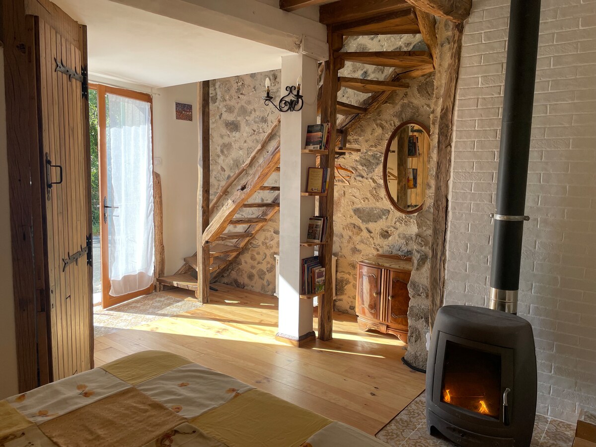 In een landelijke omgeving kom en bewonder de zonsopgangen bij het chalet van Aurore. Prachtig panoramisch uitzicht op de vallei en de bergen. Het huisje is een perfecte setting voor liefhebbers. De toegang is volledig onafhankelijk van mijn huis via een voetpad en vervolgens de Catalaanse stenen treden. Het comfortabele chalet heeft een woonkamer van meer dan 20 m2. NIEUW: er is nu een echt 140 bed + een kwalitatieve slaapsofa.